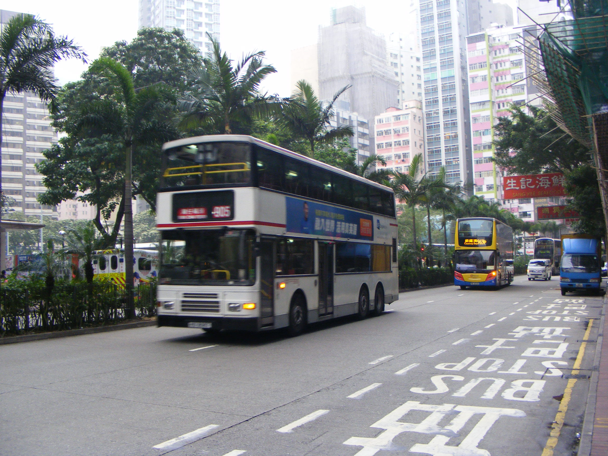 Citybus Alexander bodied Volvo Olympian 983 (HT1574) is over taken by a KMB Alexander Royale bodied Leyland Olympian near the Kowloon Star Ferry Terminal.