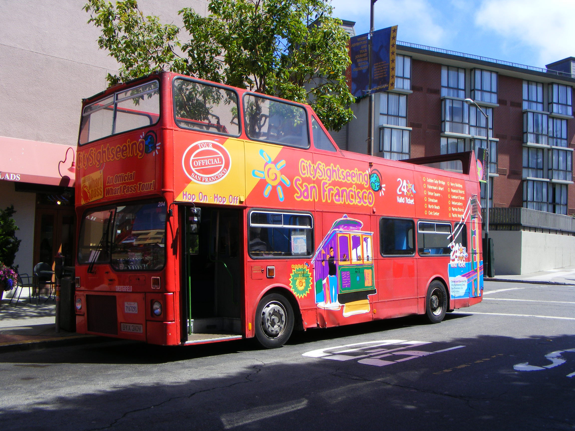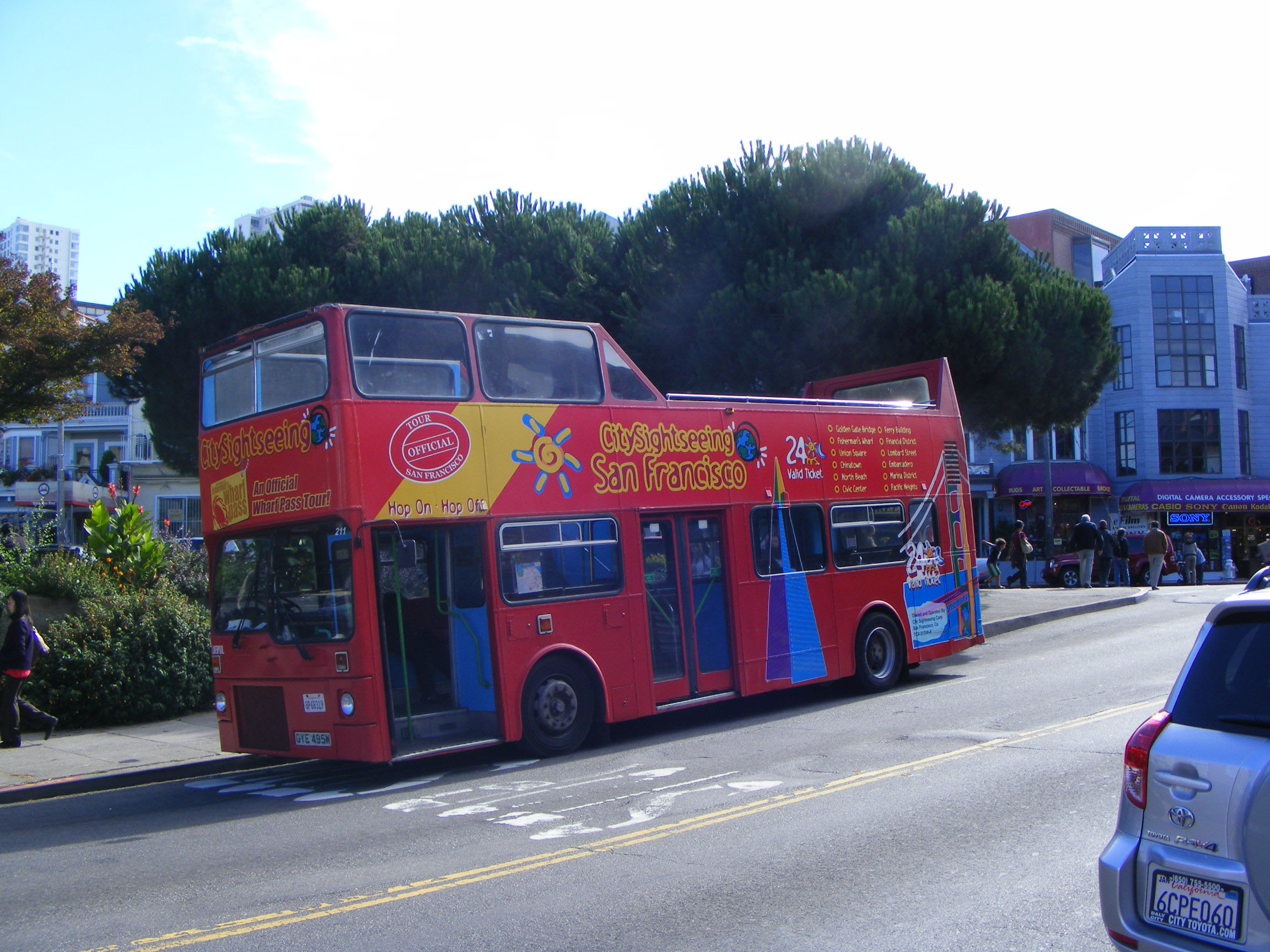 In New York the Coach USA New York Sightseeing operation was also the City Sightseeing franchisee. The fleet of new Dennis Tridents and Alexander-Dennis Enviro500s is in sharp contrast to the ex London Metrobuses in use on the west coast. Former London M310 (BYX310W) is seen at Fisherman's Wharf.