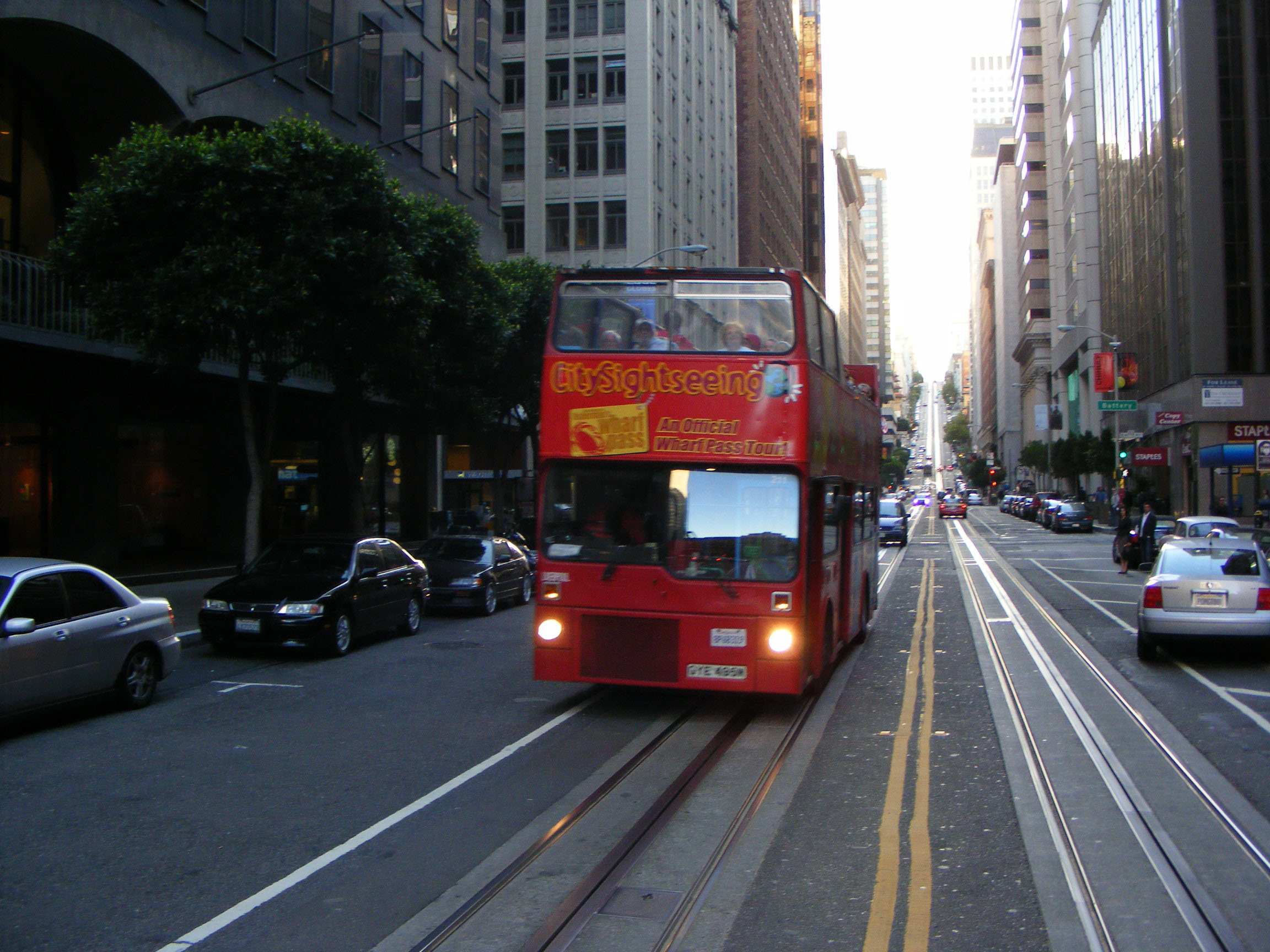 City Sightseeing M495 again on Van Ness astride the cable car tracks and accentuating its right hand drive arrangement, the Metrobus' asymmetric windscreen adding further to the incongruity. Metrobus M495 is named "Liverpool".