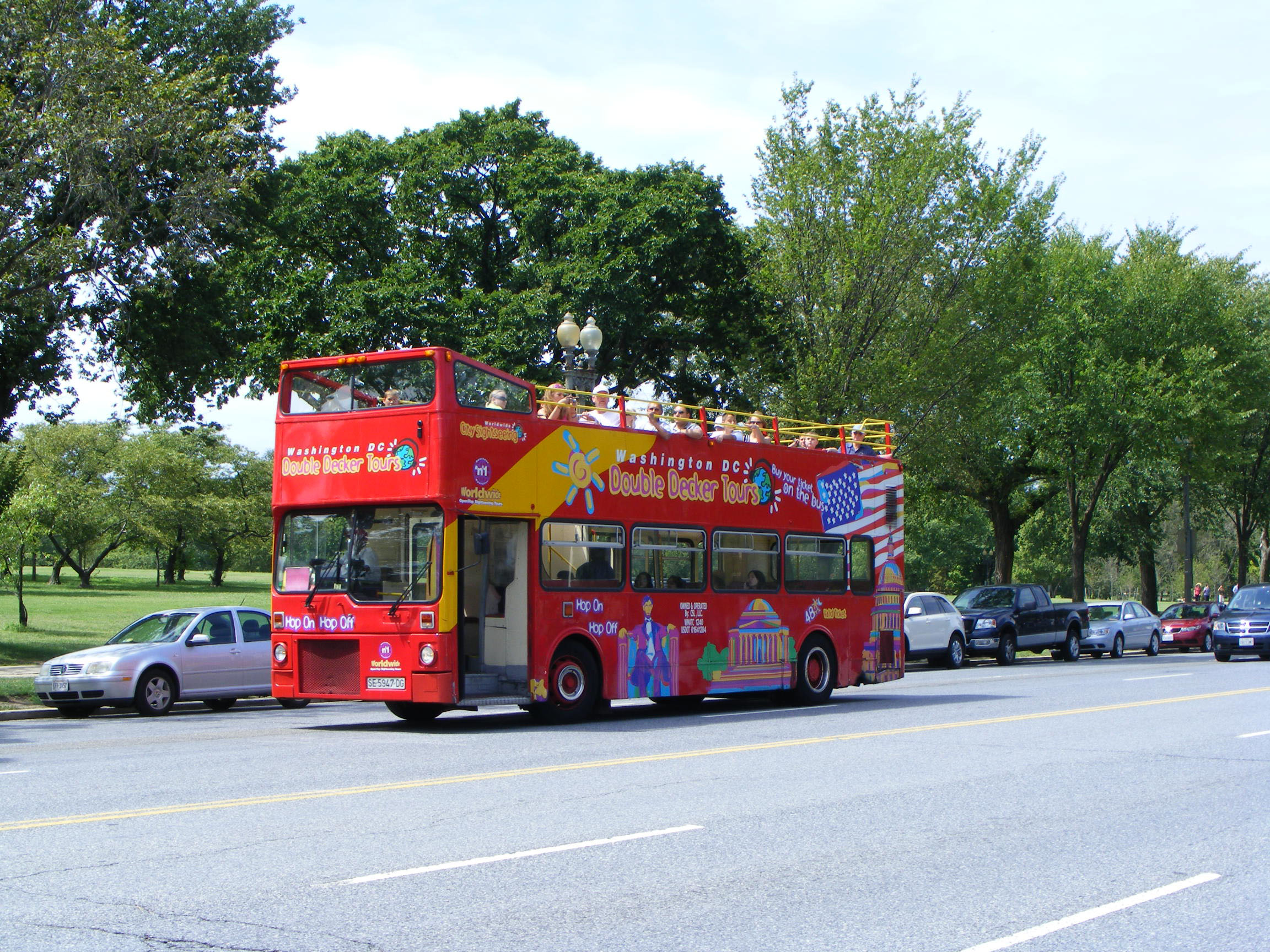 The former Seville Metrobus, 325 - though 324, ex London M224 joined it - is seen alongside the grounds in front of the White House, which is behind it.