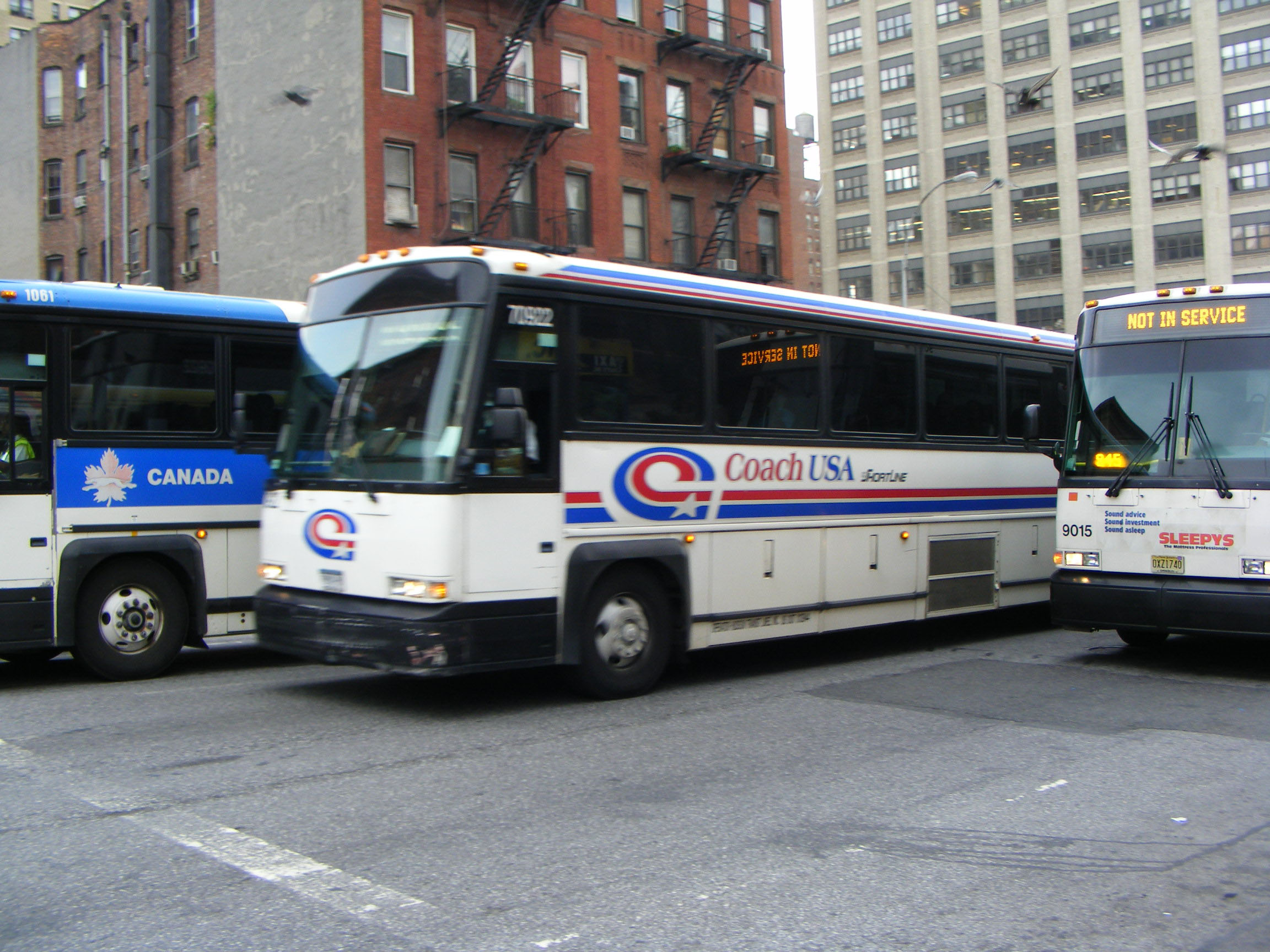 In the queue of coaches trying to access the Port Authority Coach Terminal in rush hour in August 2010, Shortline 70922 is sandwiched between other MCIs from Greyhound Canada and NJ Transit.
