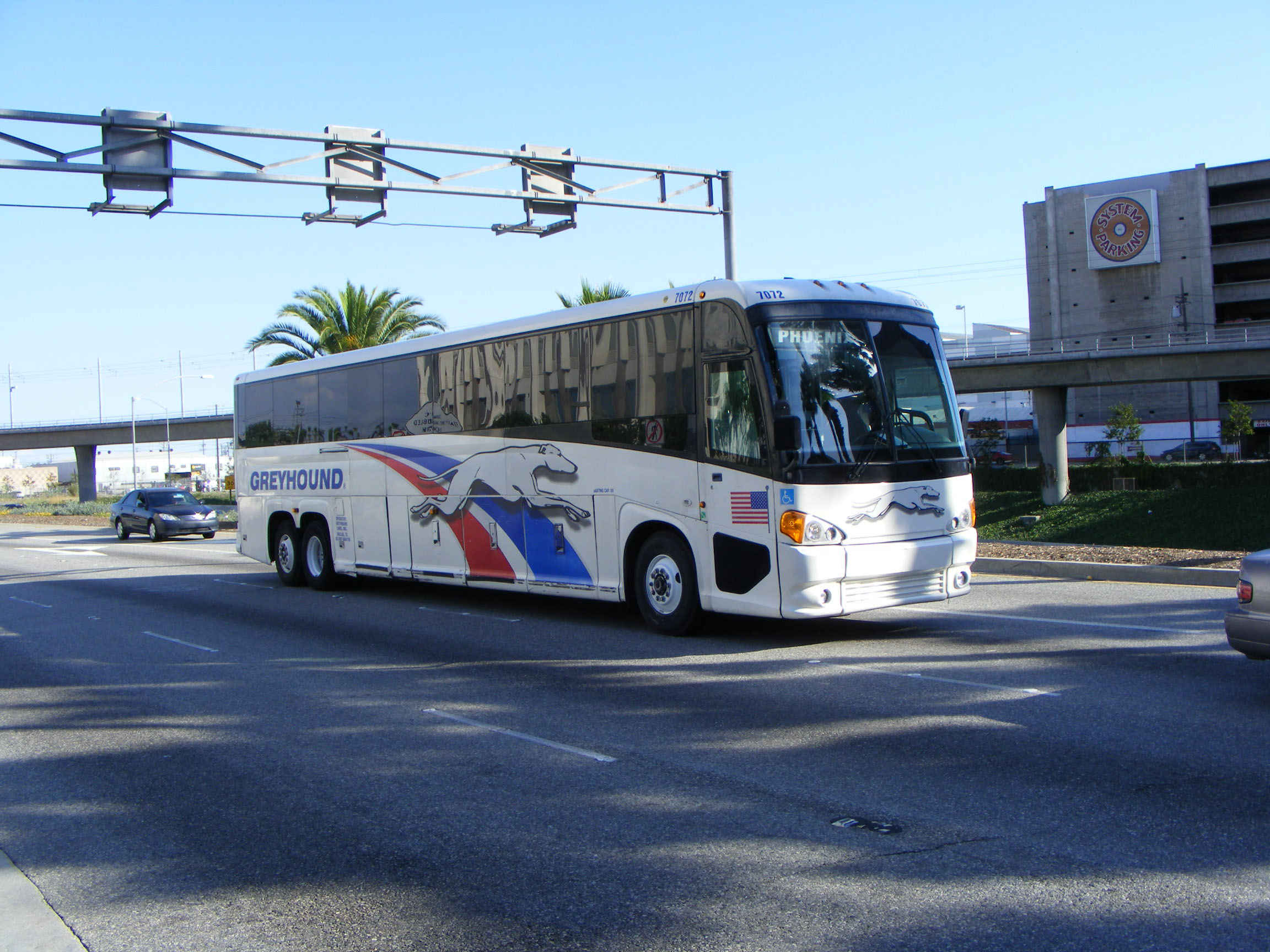 Leaving the Bay Transit Terminal in San Francisco in July 2002 is 7132, a new MCI G4500 in the then new livery shared with the Gray Line touring company. In several cities across America, Greyhound worked in partnership with Gray Line or its franchisees so the common livery facilitated interworking.