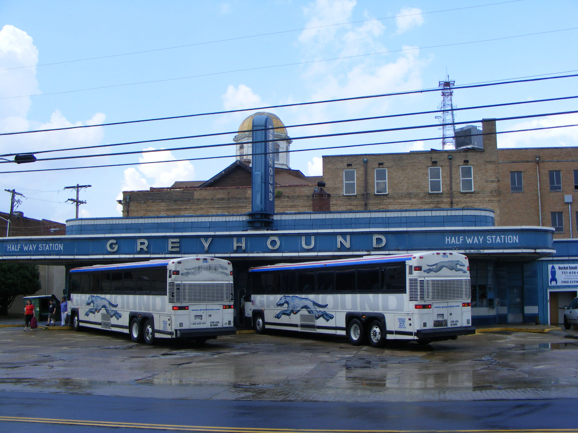 MCI 6401 and MCI 6234 nosed in to the bus bays at the Half Way Station.