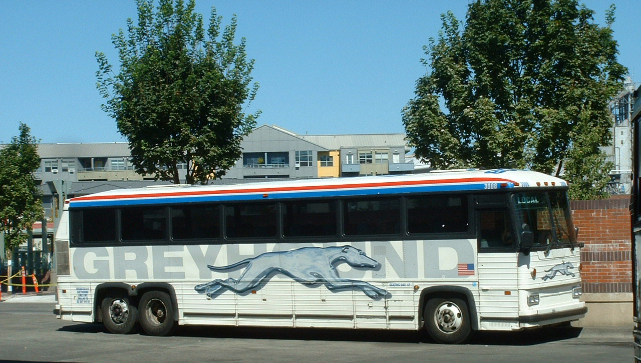 The final incarnation of Greyhound's white livery was this version with the metallic quicksilver greyhound dog logo embossed on top of a fleetname stretching the length of the bus. Elderly MCI MC-12 Americruiser 3008 was treated to the livery and is seen here at the Greyhound terminus by Union Station in Portland, Oregon in August 2007.