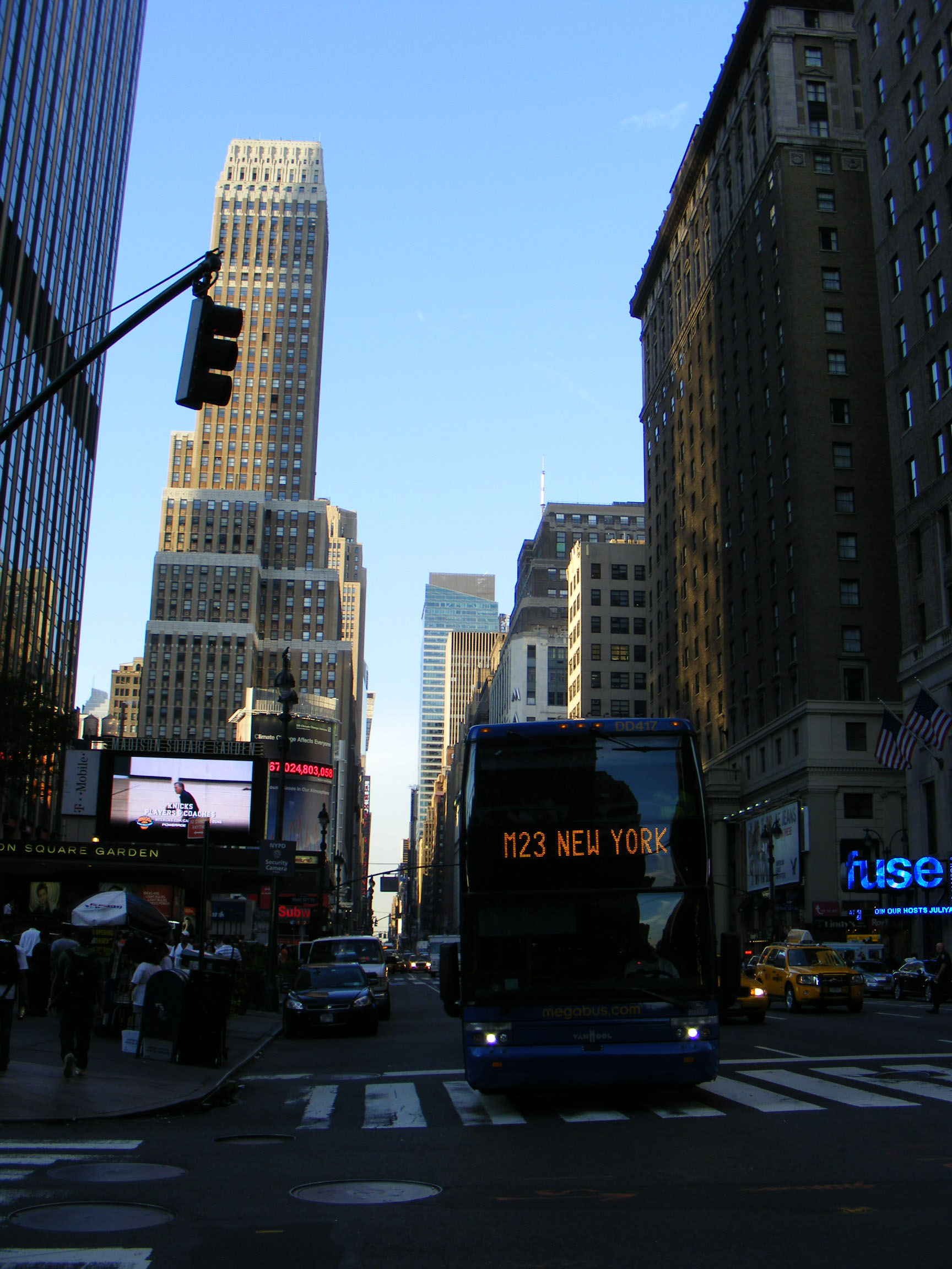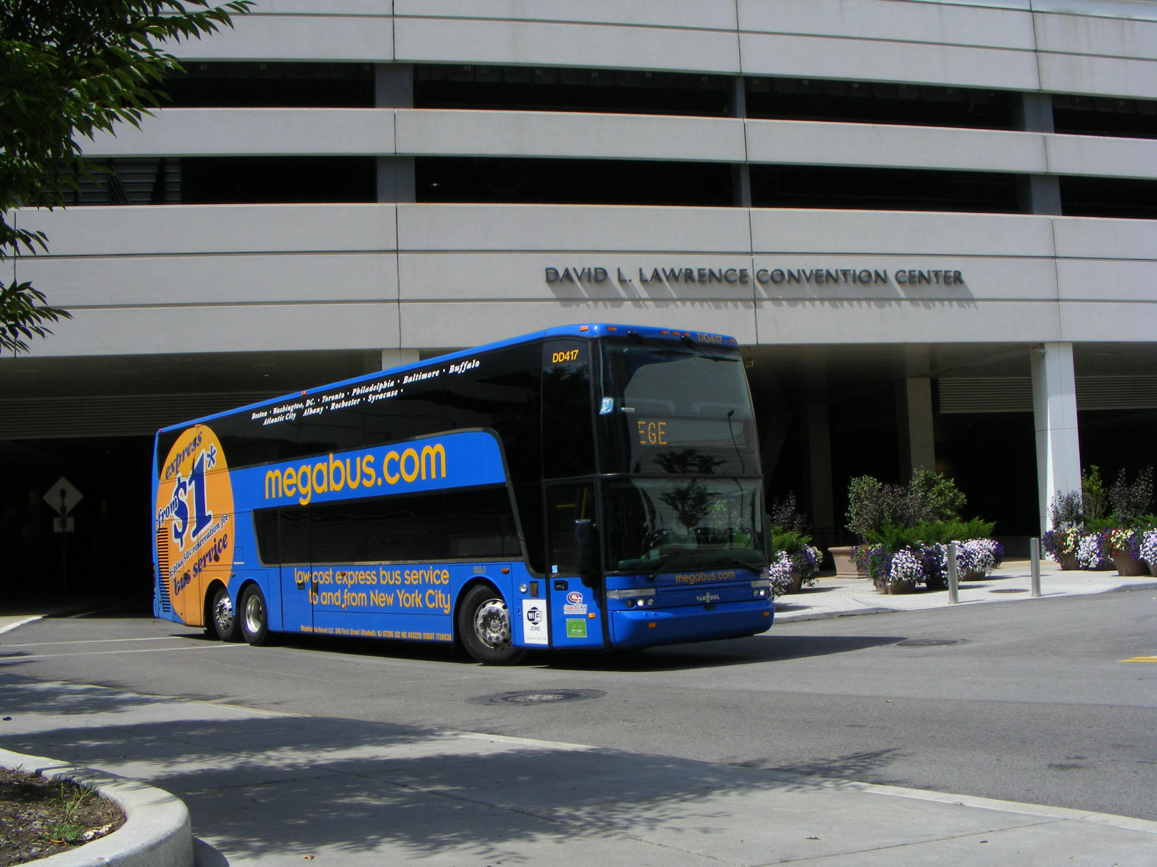 One of a number of new routes started in 2010 by Megabus links Pittsburgh with Philadelphia via Pennsylvania State CollEGE, which explains the EGE on the destination as DD417 moves off from the Pittsburgh downtown street stand at the David L Lawrence Convention Center in July 2010. |