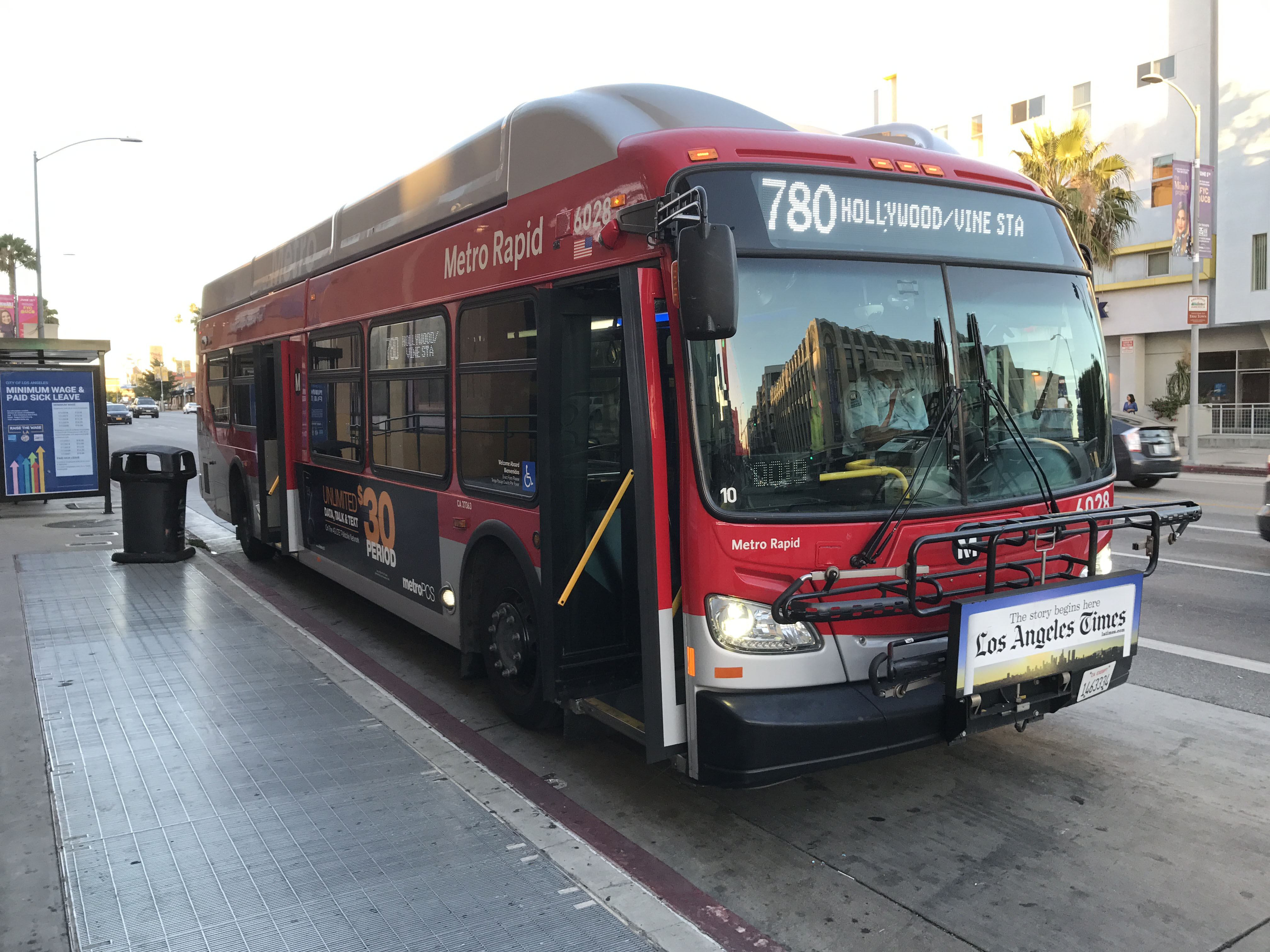 In June 2017 Xcelsior 6028 is seen on Hollywood Boulevard, nearing the end of its journey to the Hollywood and Vine Station.