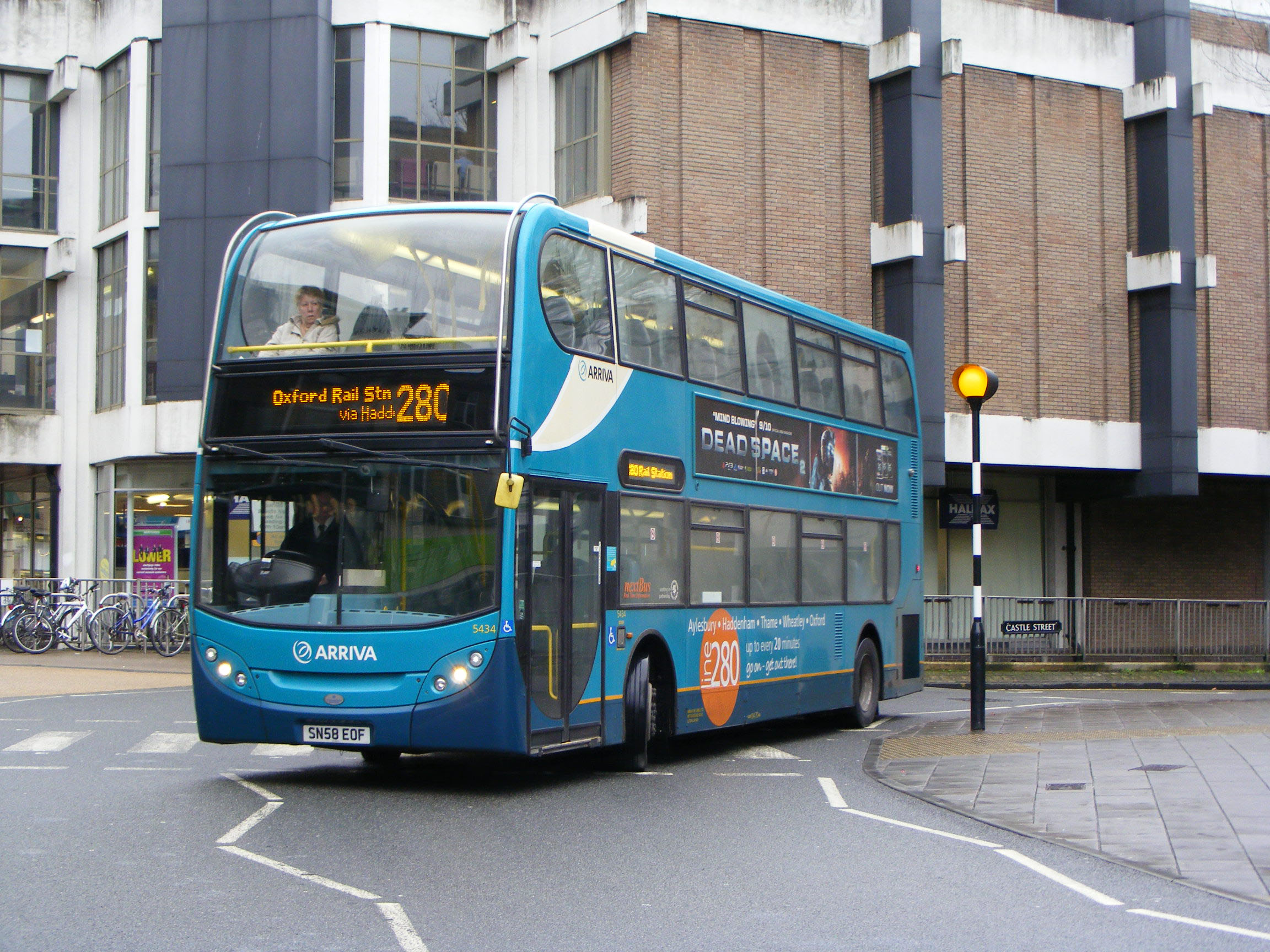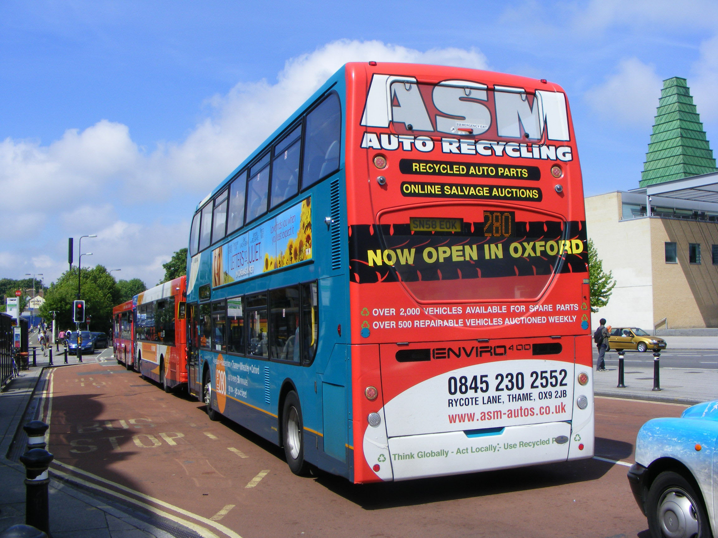 Seen on its approach to the Station, 5438 has a rear ad for Aylesbury Scrap Metals, a common feature on Aylesbury buses. Luckily 5438 is some way off visiting ASM, though the adverts on some Aylesbury buses had a prophetic destiny about them. The Enviro is following buses from the two competing local operators: Stagecoach Oxford and the Oxford Bus Company. |