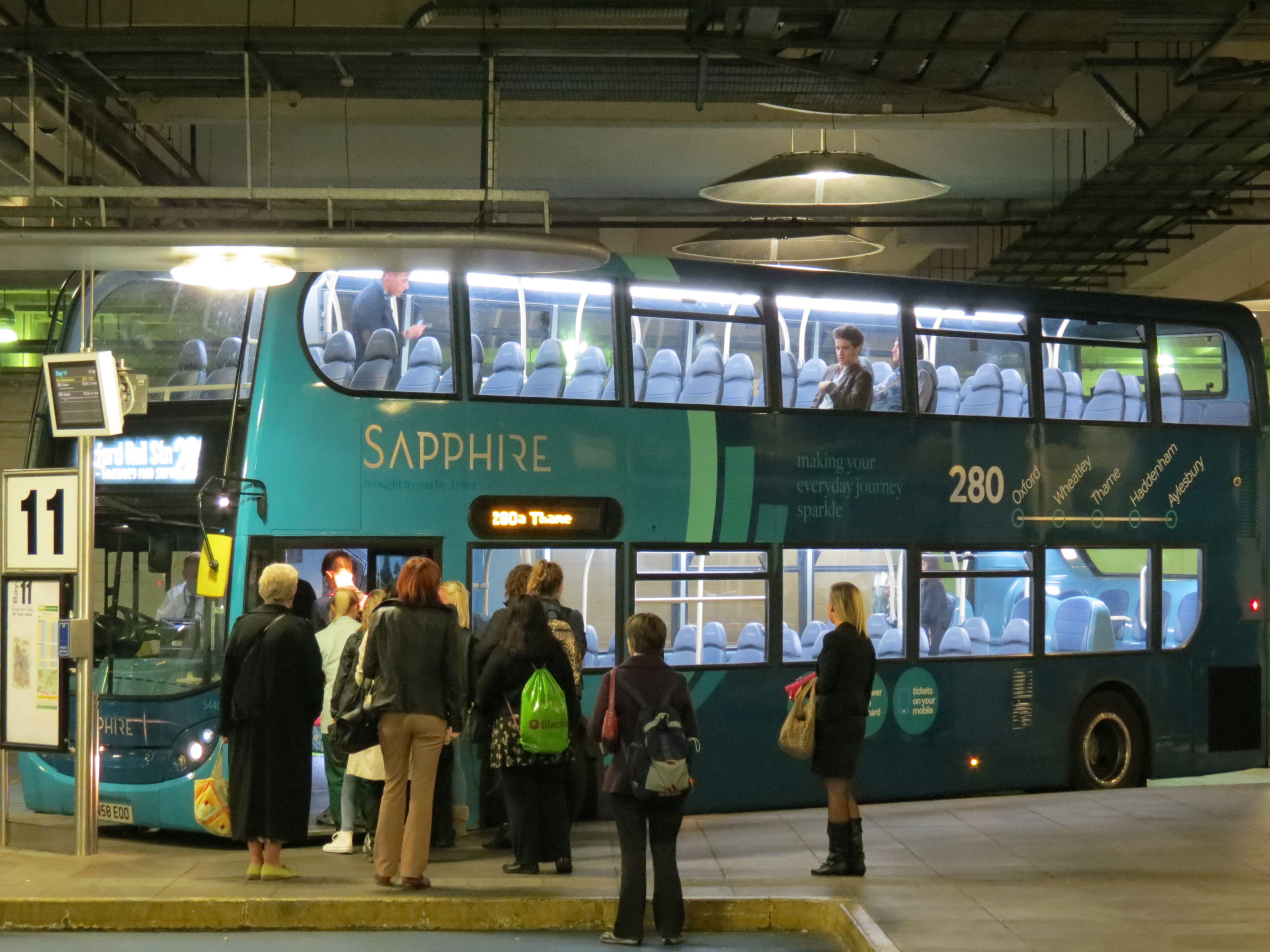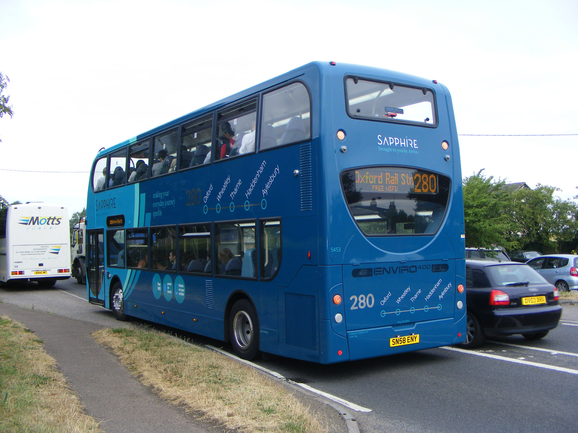 In 2013 the 280 was one of the first Arriva routes to be upgraded to Sapphire specification. The existing fleet of Enviro400 buses were refurbished with fewer e-leather seats, wifi and charging points. Seen in July that year passing through the village of Tiddington between Oxford and Thame is 5453 (SN58ENY). |