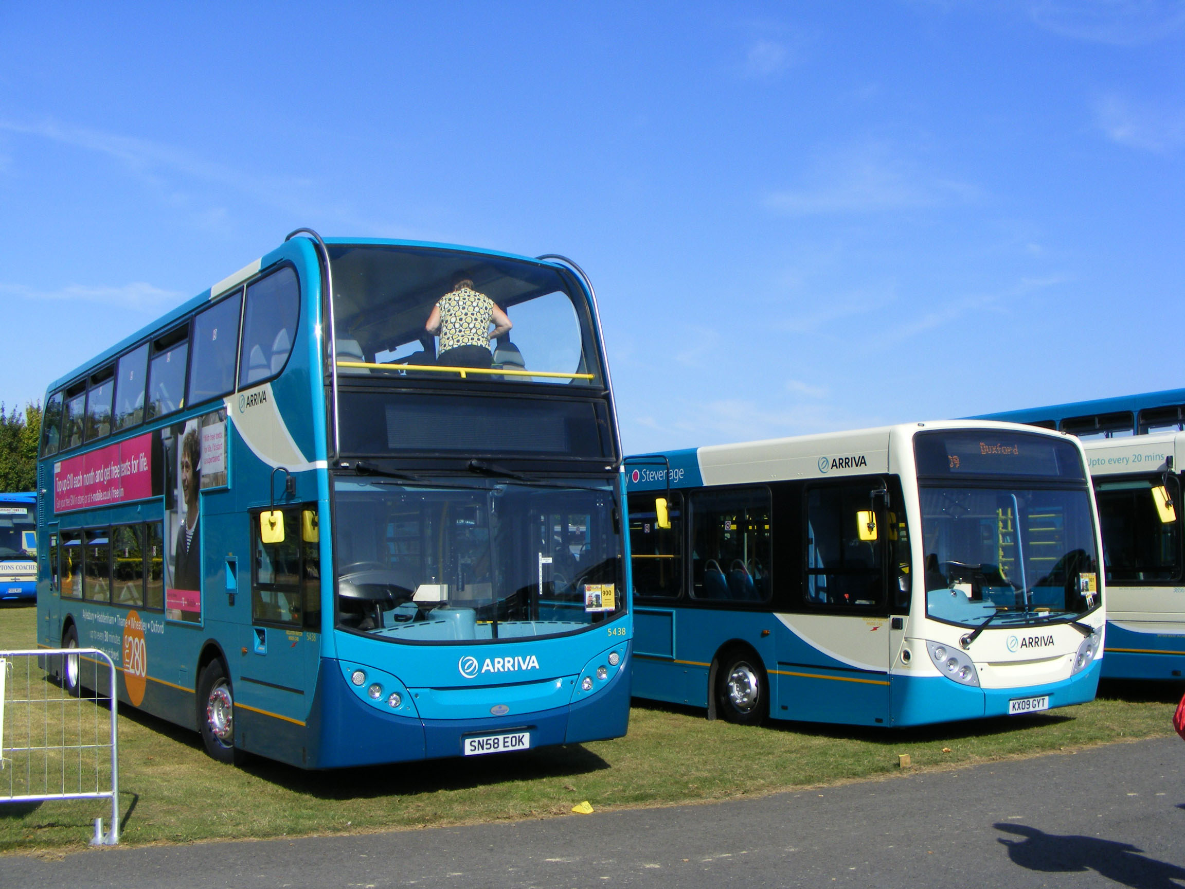 In something of a final fling for the Wycombe depot of Arriva, a number of relatively smart, i.e. recently repainted, buses was allocated to the depot, a mixture of Optare Versas and doubledeck Enviros, the latter intended for the 800/850 services to Reading, the reality being that they more often found themselves pootling around Wycombe, so this September 2023 shot of 5459 Reading bound - not that the electronic blind affords that sight - was lucky. It is just about to climb Desborough Avenue to Handy Cross and then over the M40 to Marlow and beyond affording great doubledeck views along the Thames Valley. The bus was new as a Sapphire 280 and is seen above, when new, arriving at the Imperial War Musem for the last Duxford SHOWBUS.