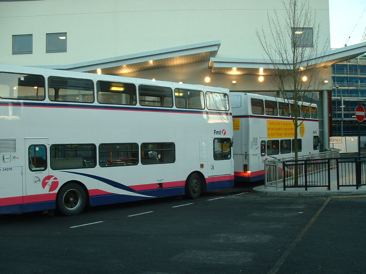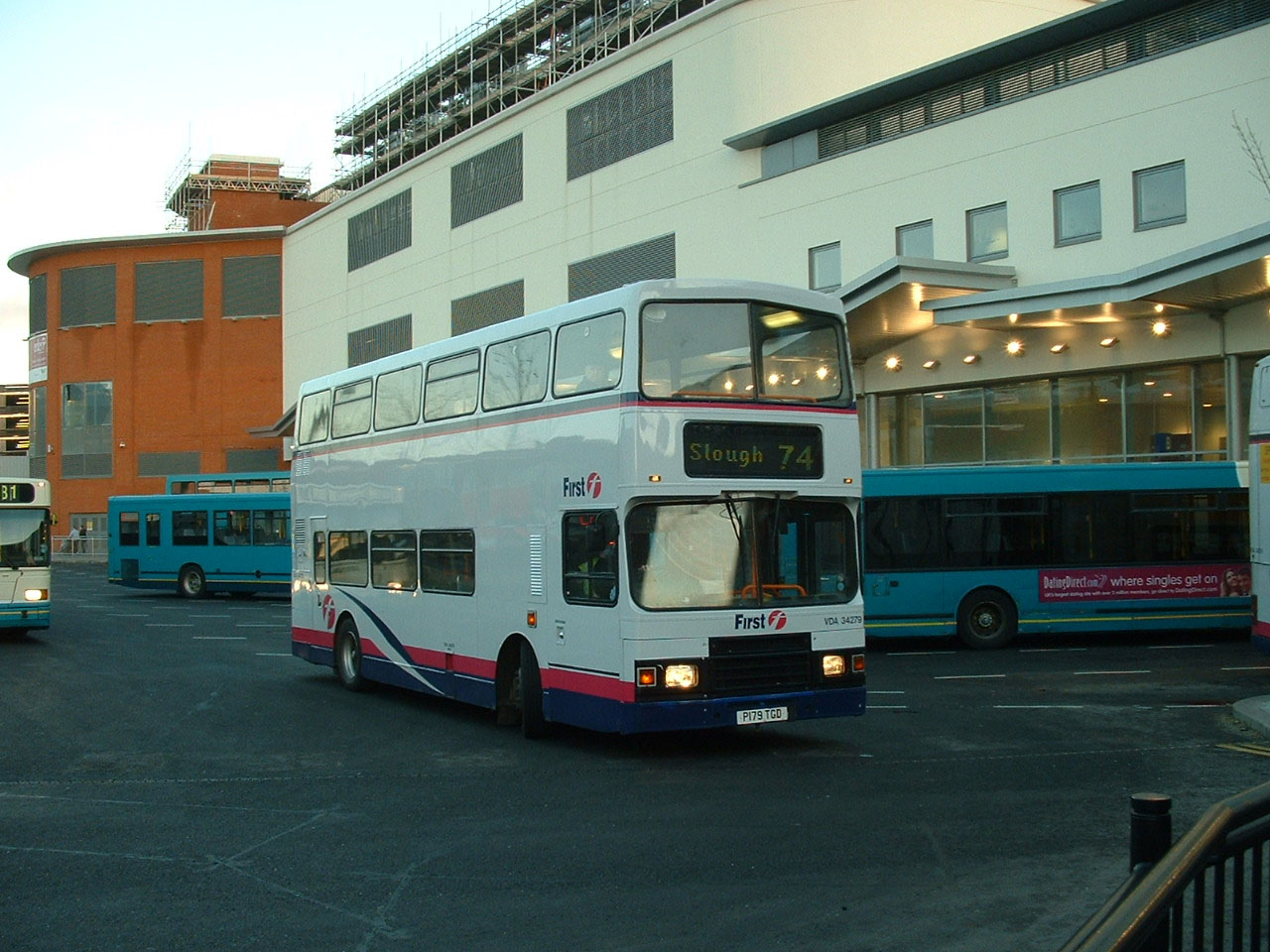 The First Beeline fleet was not totally singledeck and at one stage a handful of ex Glasgow Olympians were used. Unusually two are seen here together in the new High Wycombe Bus Station in February 2007. They are both on the 74 service from Slough which competed with Arriva's identical route. The Olympian covered in yellow posters is the regular bus used and the posters promote the route - and in particular the ticket which gives inclusive use of all Slough Beeline services. Unfortunately the bus has failed and sister 34729 (P179TGD) has been sent to substitute. ![]() |