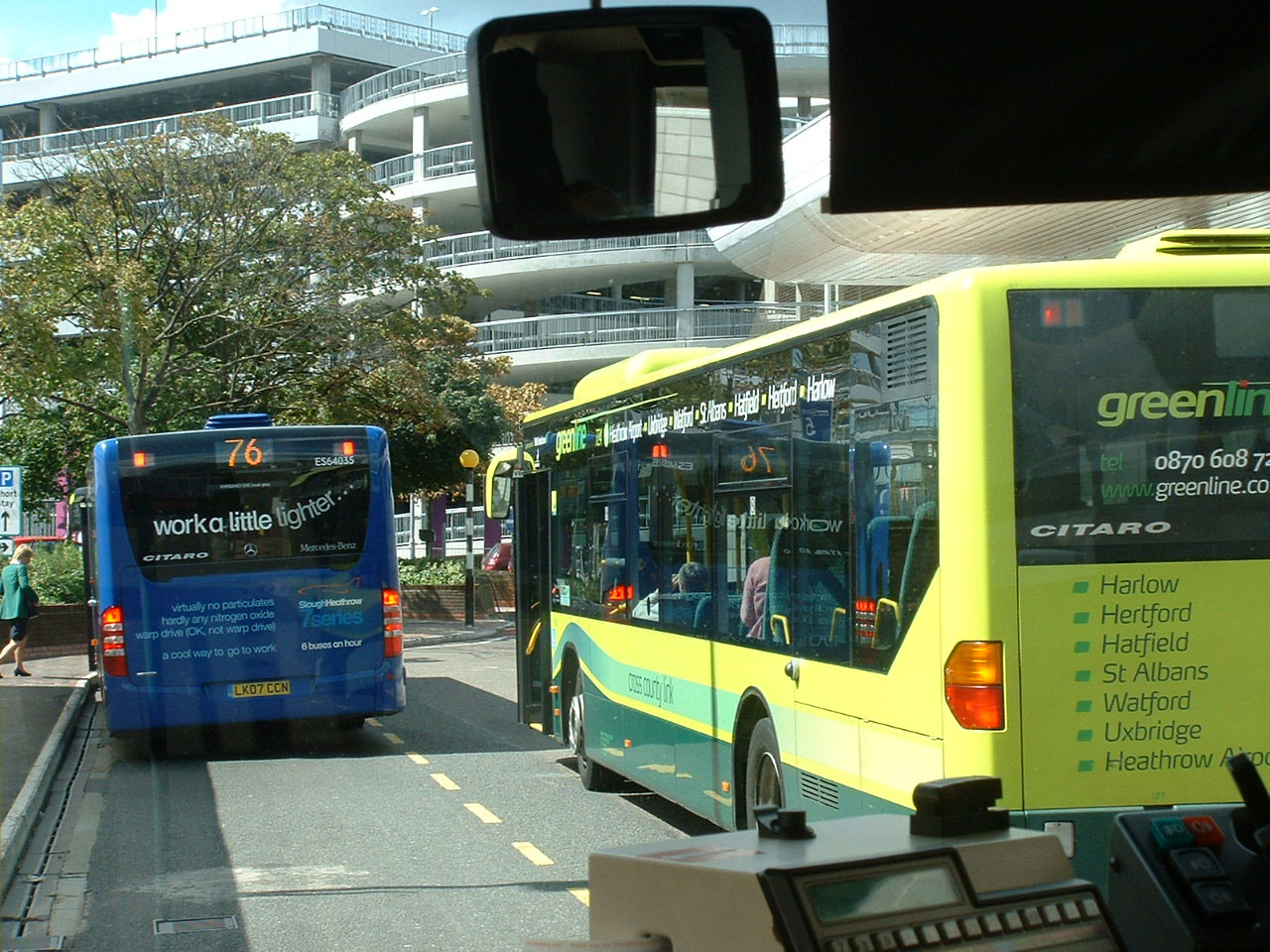 Seen from the front passenger seat of the Carousel A40 service to High Wycombe, Arriva the Shires Green Line Citaro 3902 (BU06HSE) swiftly departs, overtaking the new SHOWBUS Citaro, ES64035, fitted with warp drive (not), but perhaps the Green Line Citaro would keep better time if it was! |