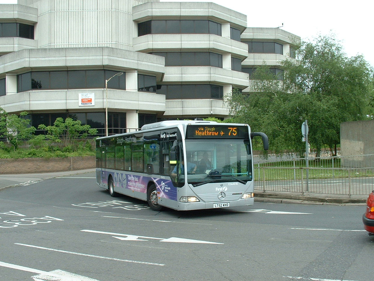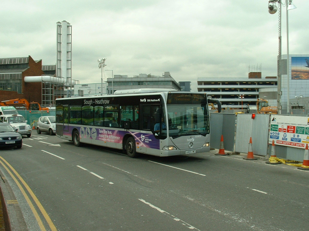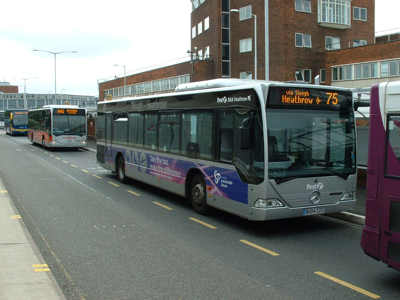 Mercedes ES64021 is seen here in service at Heathrow in 2004, one of a pair of Citaros bought to supplement the service that year. Behind is a similarly liveried vehicle with red in place of purple for Carousel's Freeflow Heathrow A40 route from High Wycombe. |