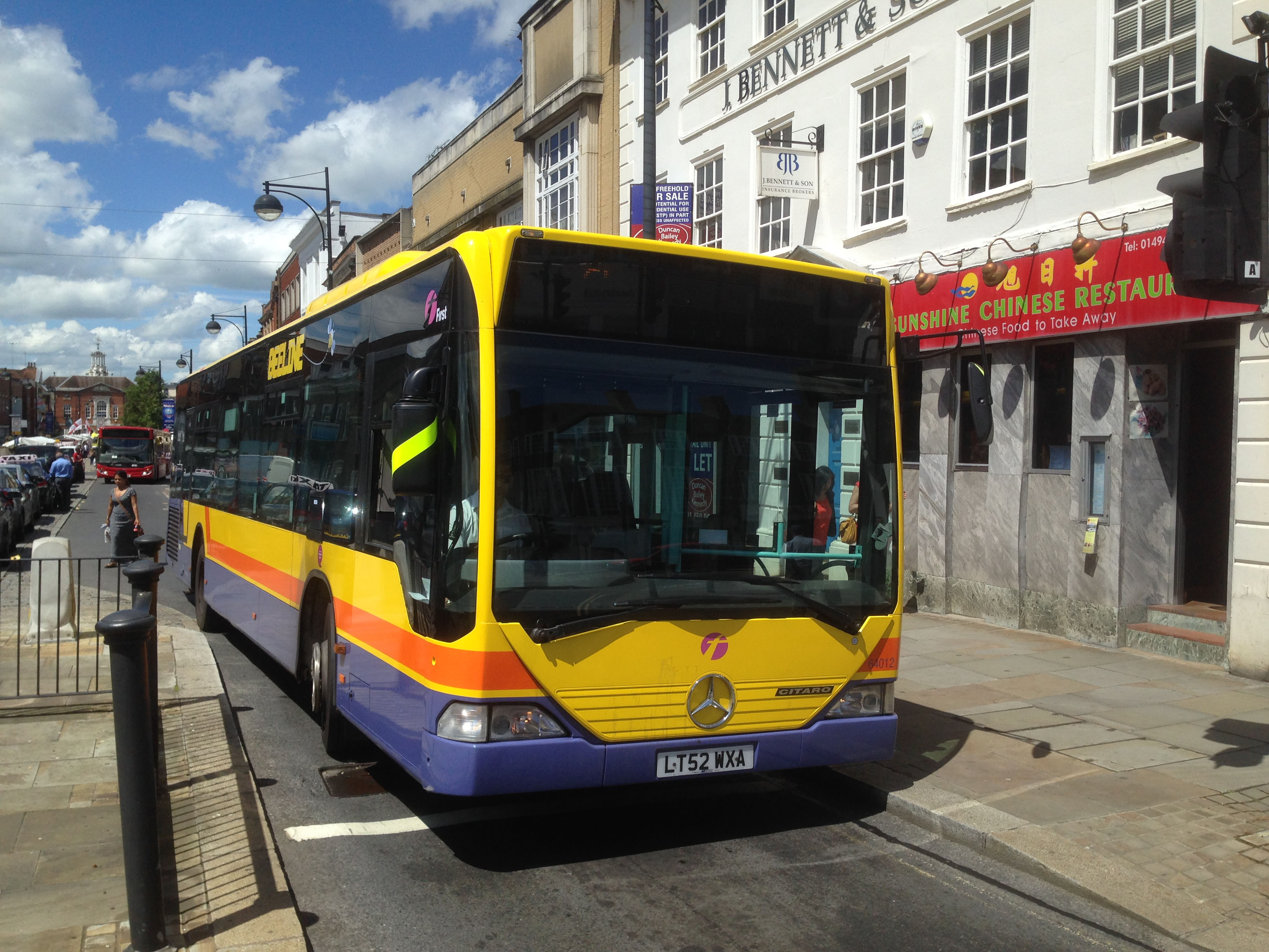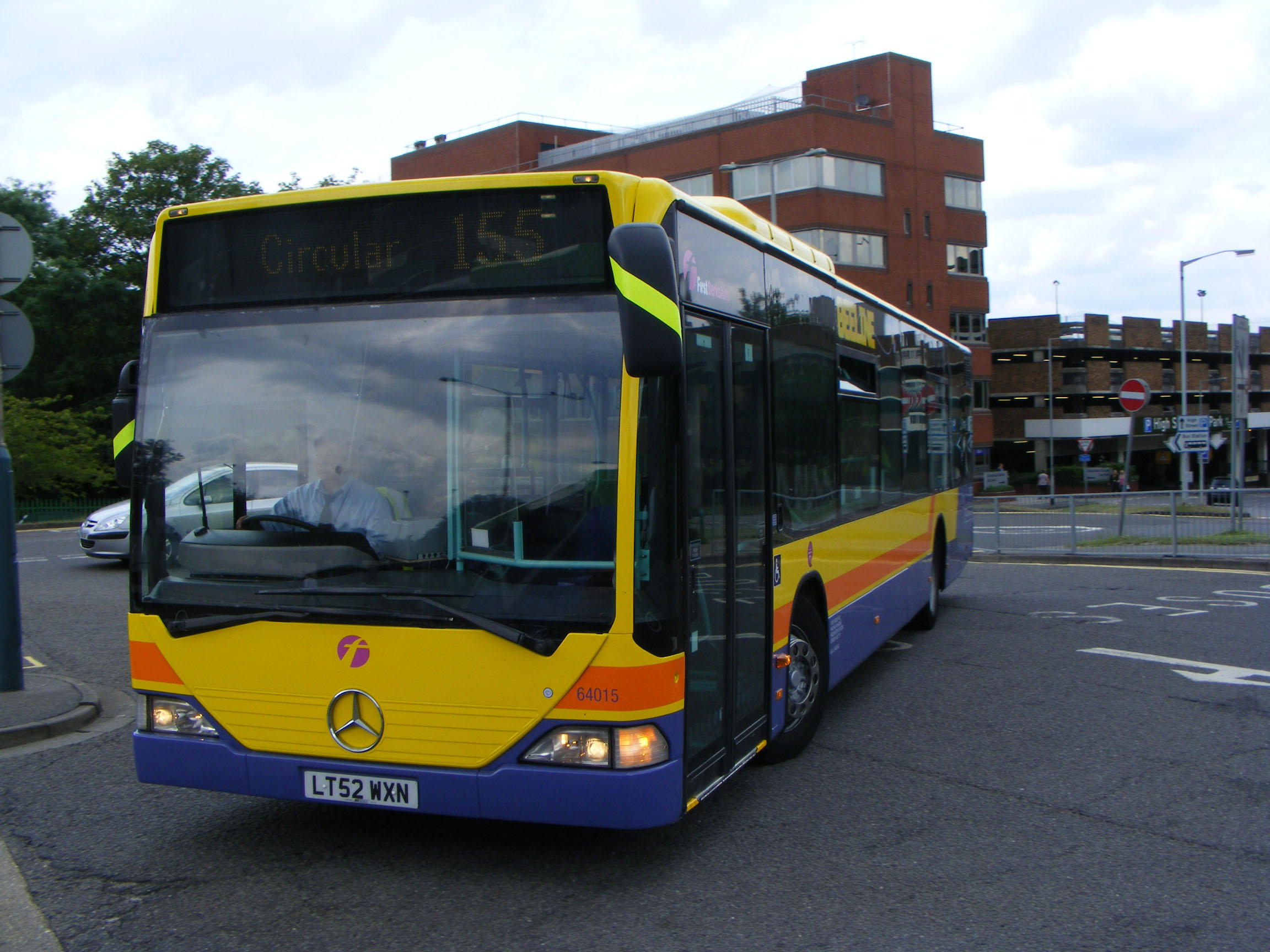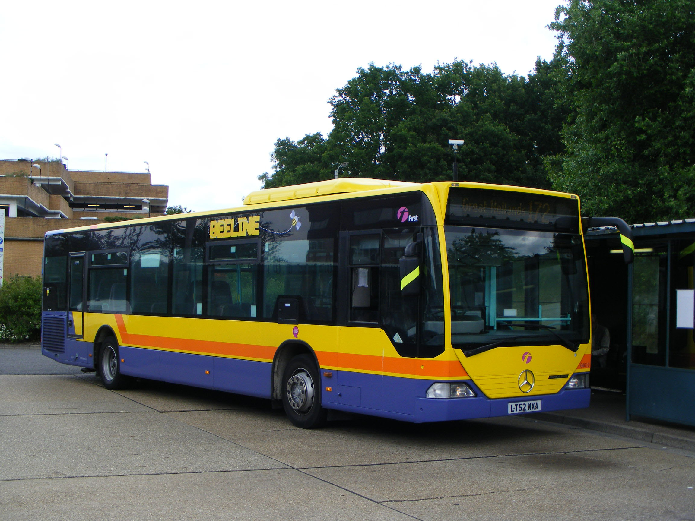 In 2013 a liberated First started to abandon its corporate livery and began using different colour schemes for marketing purposes. With town services under attack from competitor, Courtney Buses, First revived the yellow Beeline livery on Mercedes Citaro buses rendered surplus from Heathrow services following the delivery of hybrid Volvos. Seen in Bracknell Bus Station in June that year is 64012 (LT52WXA). |