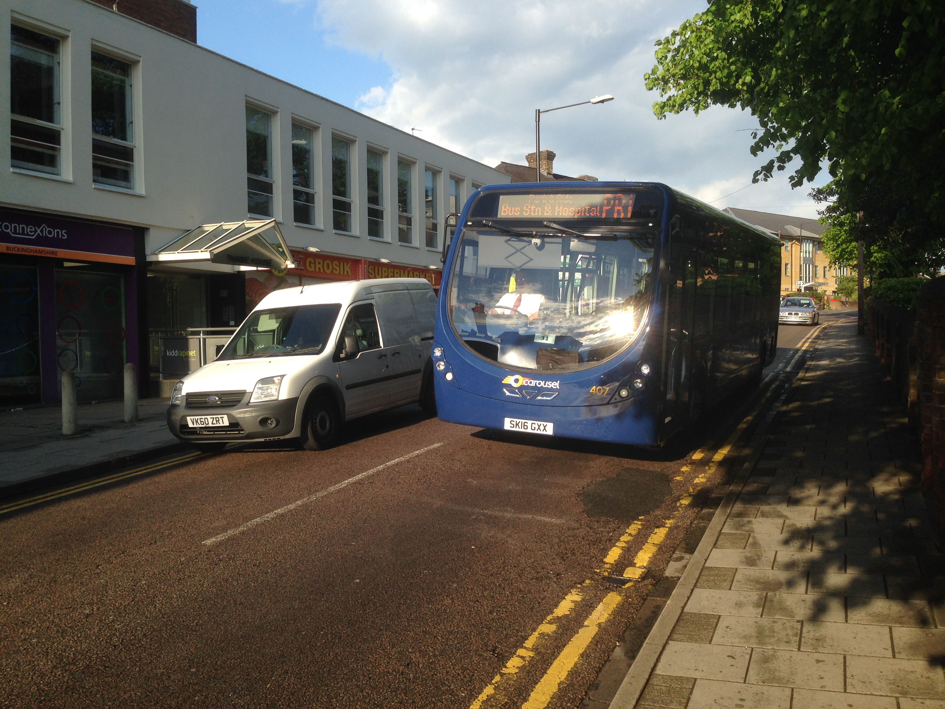 Turning from Bridge Street, where the Bus Station is located, into Desborough Road is 409 again in August 2016 bound for the Coachway.