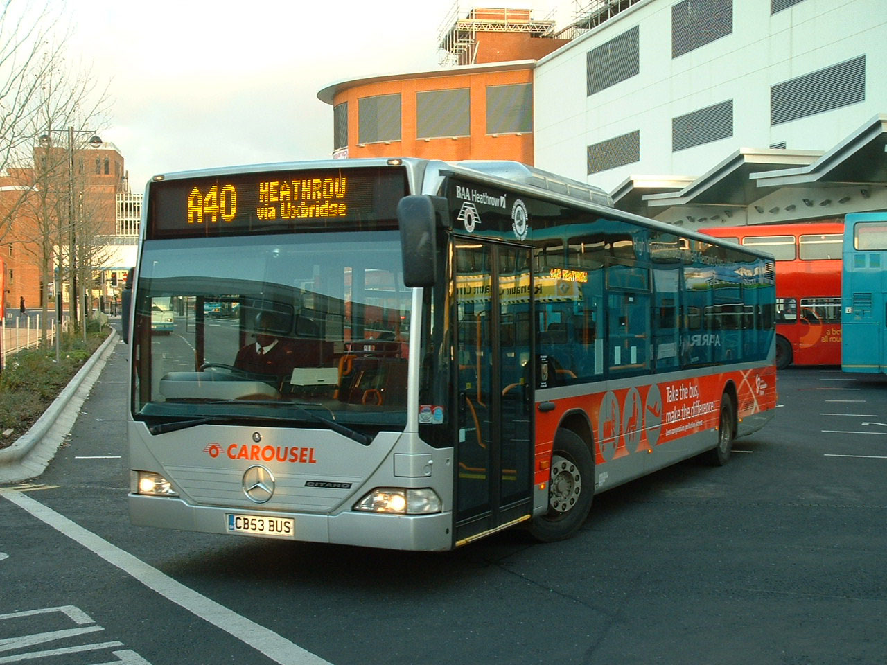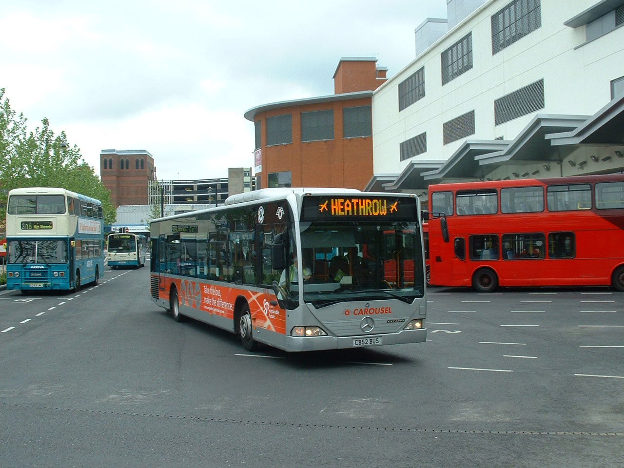 An August 2004 view of MB52 (CB52BUS) at Heathrow shows the vinyls that had by then been deployed on the fleet. matching the ones used by First Beeline, one of whose Citaros can be seen in front. |