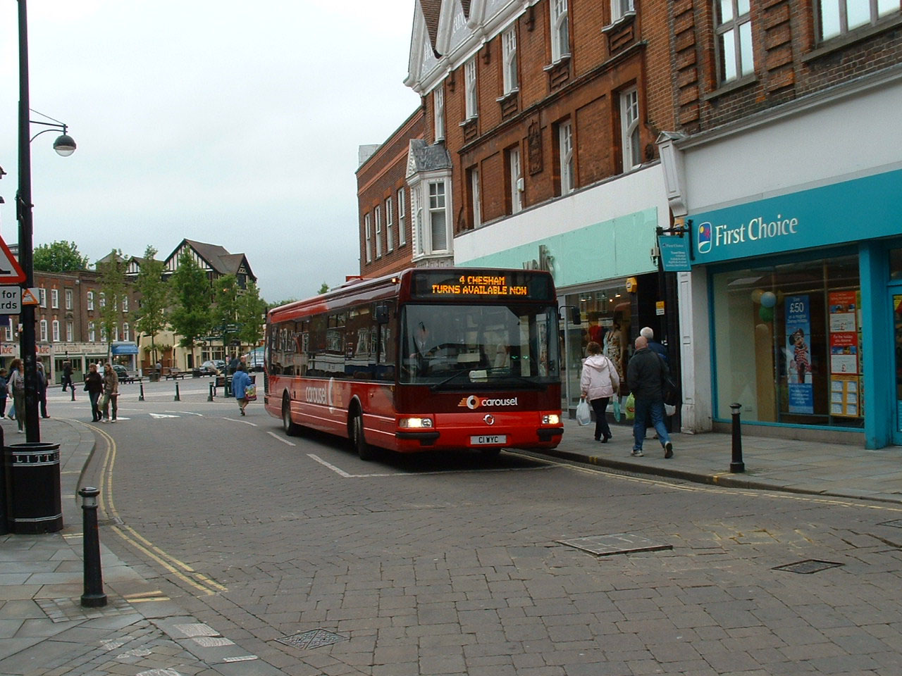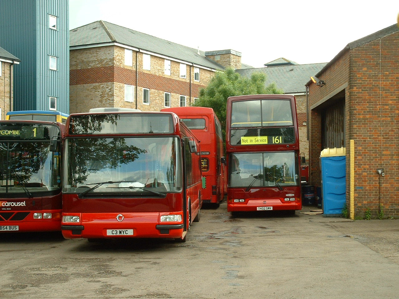 Carousel acquired three of the Irisbus Agoras built for the UK with bodies finished by Optare. Suitably registered C1WYC & C2WYC were acquired in 2005 with a third being prepared for service when this picture was taken on May 17th 2006. The buses were bought for route 4, which competed with Arriva between Wycombe and Chesham. The picture was taken as AL2 (C2WYC) parked up at 7.30pm, and then the gates of the depot, with all the buses crammed in, were locked for the night. |