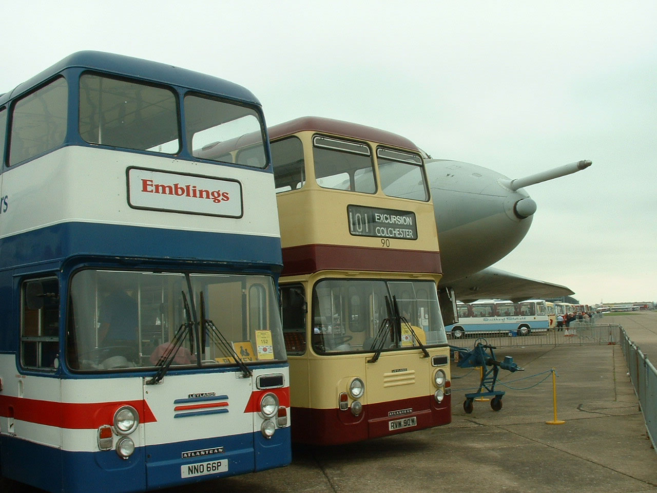 In 2005 the opportunity was taken to park 90 next to Embling's older yet identical former Colchester 66 (NNO66P) under the shadow of Duxford's Vulcan bomber. Atlantean 66 was part of a long line of Embling Bristol VR buses with very similar ECW bodies on display that year.