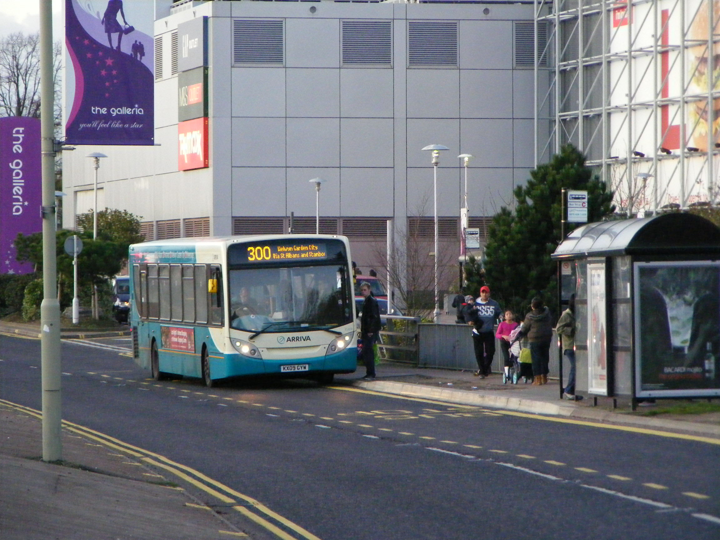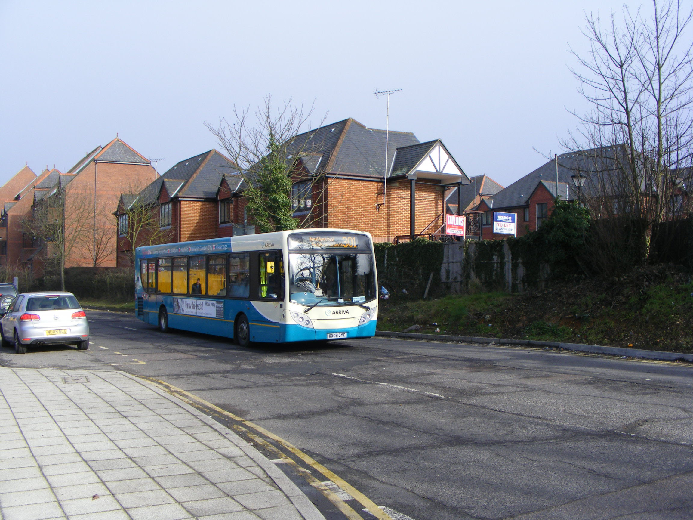 Sister vehicle 3555 (KX09GYE) is seen earlier in December at Welwyn Garden City with more prominent route branding on the nearside.