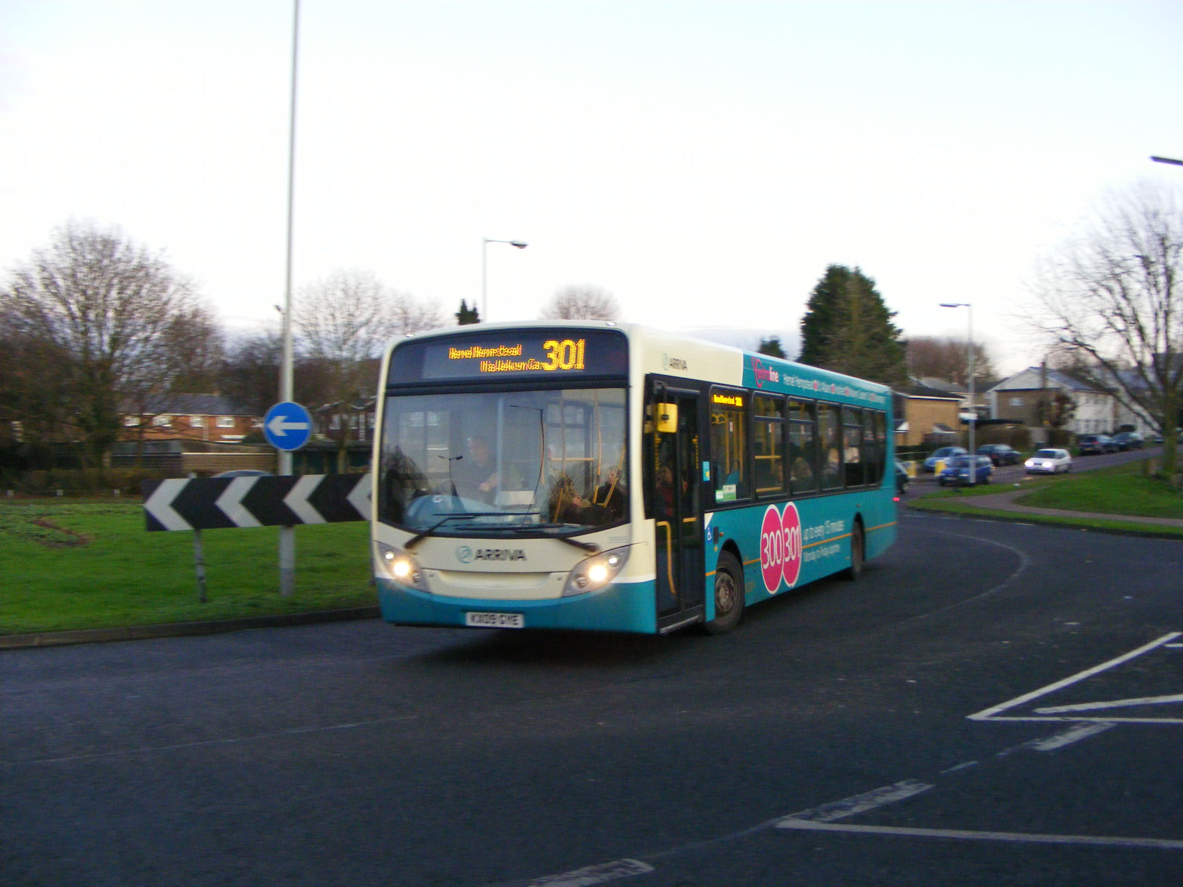 In summer 2009 Arriva bought a batch of twenty 45 seat Alexander Dennis Enviro300 singledeckers for the long distance 300/302 services to replace ageing Volvo B10BLE Wright bodied buses which were displaced to High Wycombe for the trunk services to Reading. Another seven were delivered in red livery for route 4 in Milton Keynes, but did not last long before repaint into the then new standard Arriva livery. This is 3553 (KX09GYC) seen in February 2010 on the 301 approaching St Albans Station.