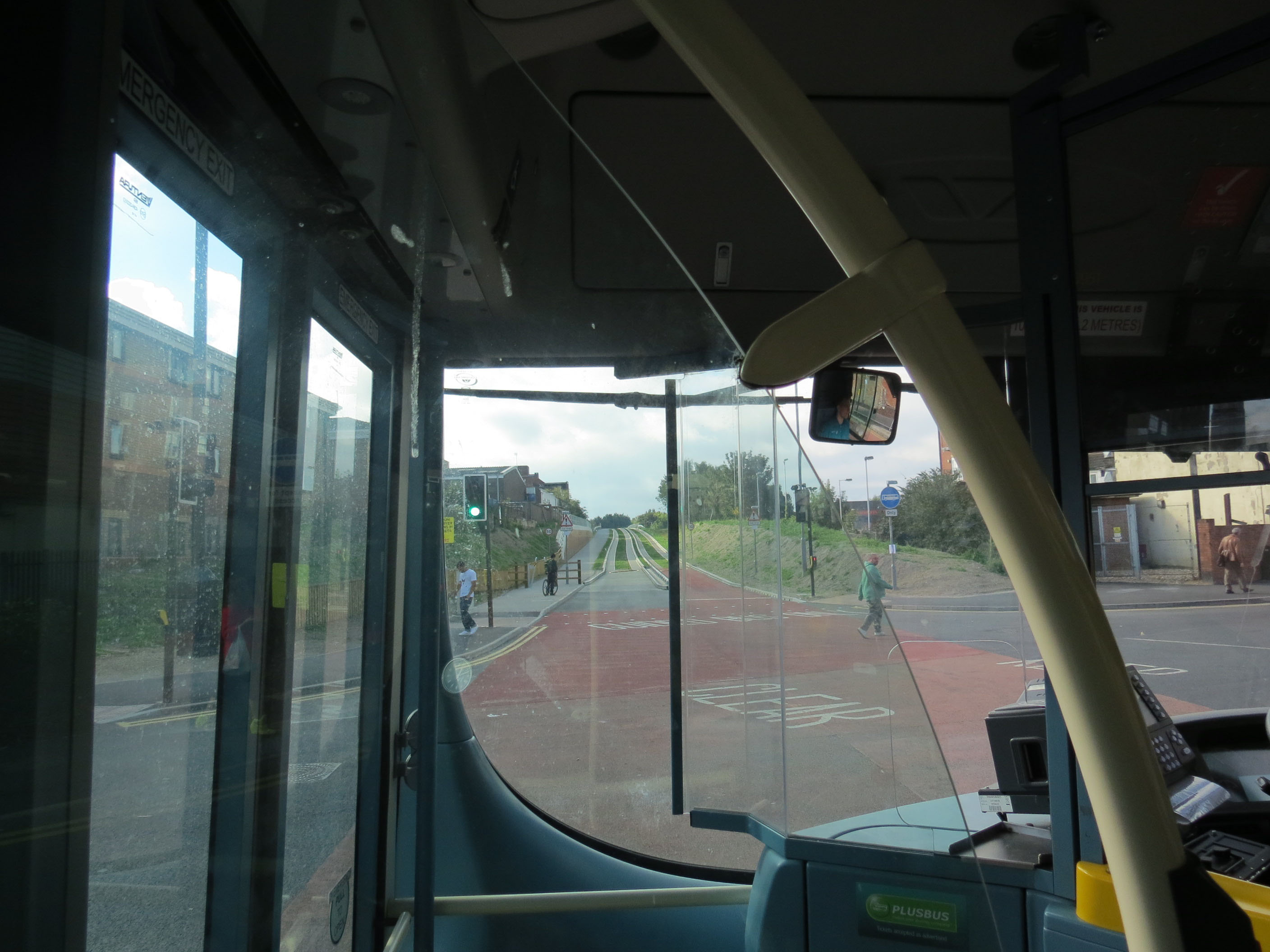 The Luton Busway had only been opened a month when these photos were taken from the front seat of one of the Wright bodied Volvo B7RLE buses used on the route linking Luton to Dunstable. The bus cruised along the guided busway at up to 50mph. First mooted in 1989, it took over twenty years for the old railway branch line to become the busway. |