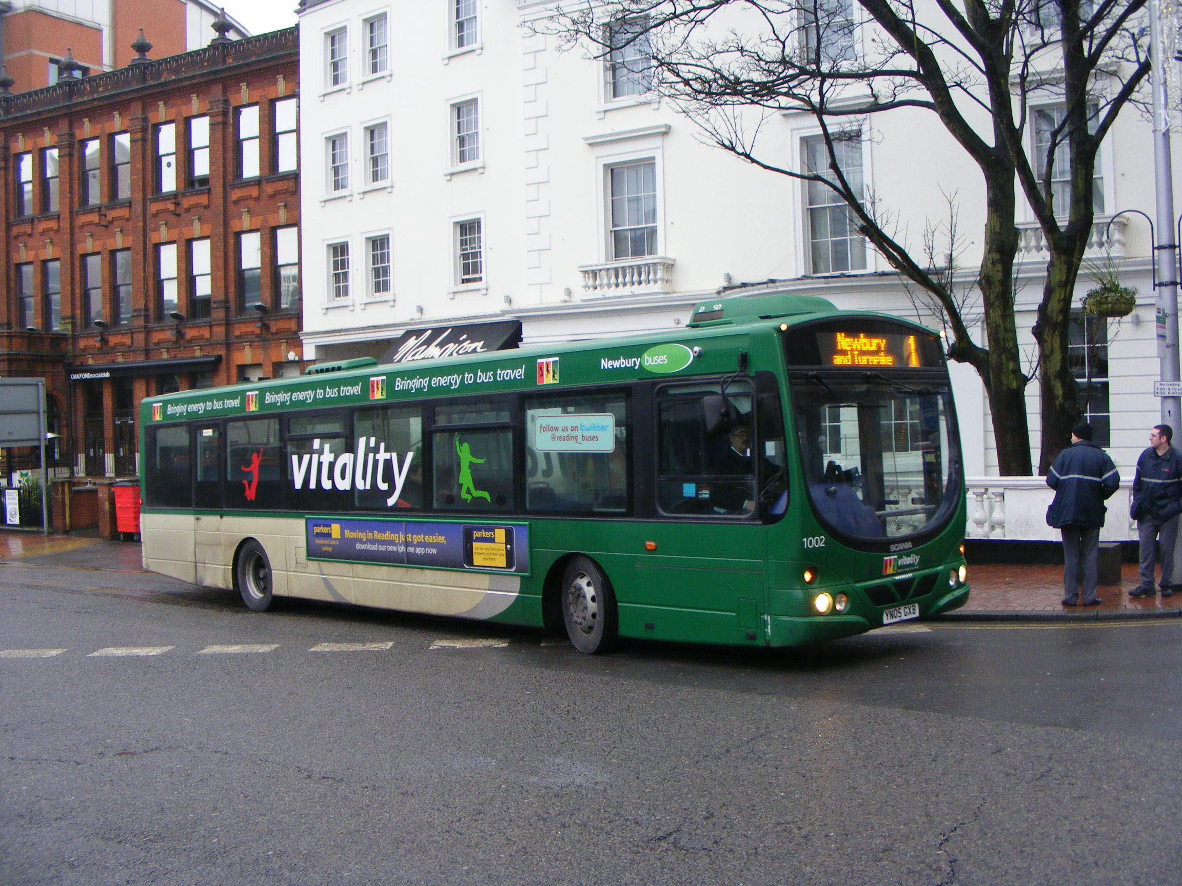 Newbury Buses Wright bodied Scania L94UB 1002 (YN05GXB) is seen in Reading in December 2010 on the 1 service linking Reading with Newbury with the Vitality branding used on rural services by both Reading and Newbury operations. A few months later the service was rebranded Jetblack and franchised to Newbury & District with a new fleet of Alexander Dennis Enviro400 diesel buses.