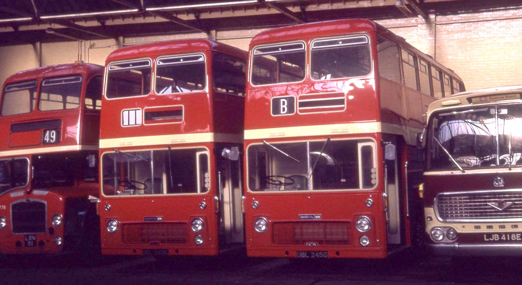 By the time the picture above was taken, the four Bedfords were in reserve for Heathrow duties, distinctive Duple Commander bodied Bristol RELH6G had taken their place. Bristol C424 (RJB424F) is seen at Heathrow with old fashioned BEA Routemasters in attendance. |