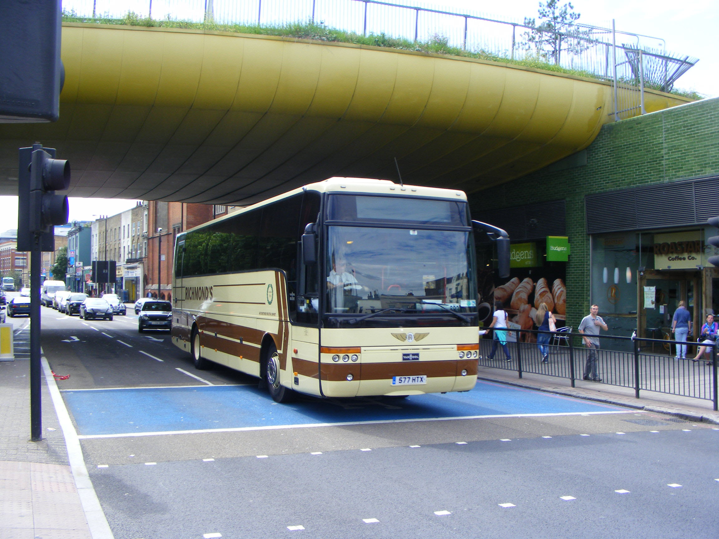 In June 2011 Van Hool bodied VDL SB4000, 577HTX, is seen near Mile End Station on Mile End Road.