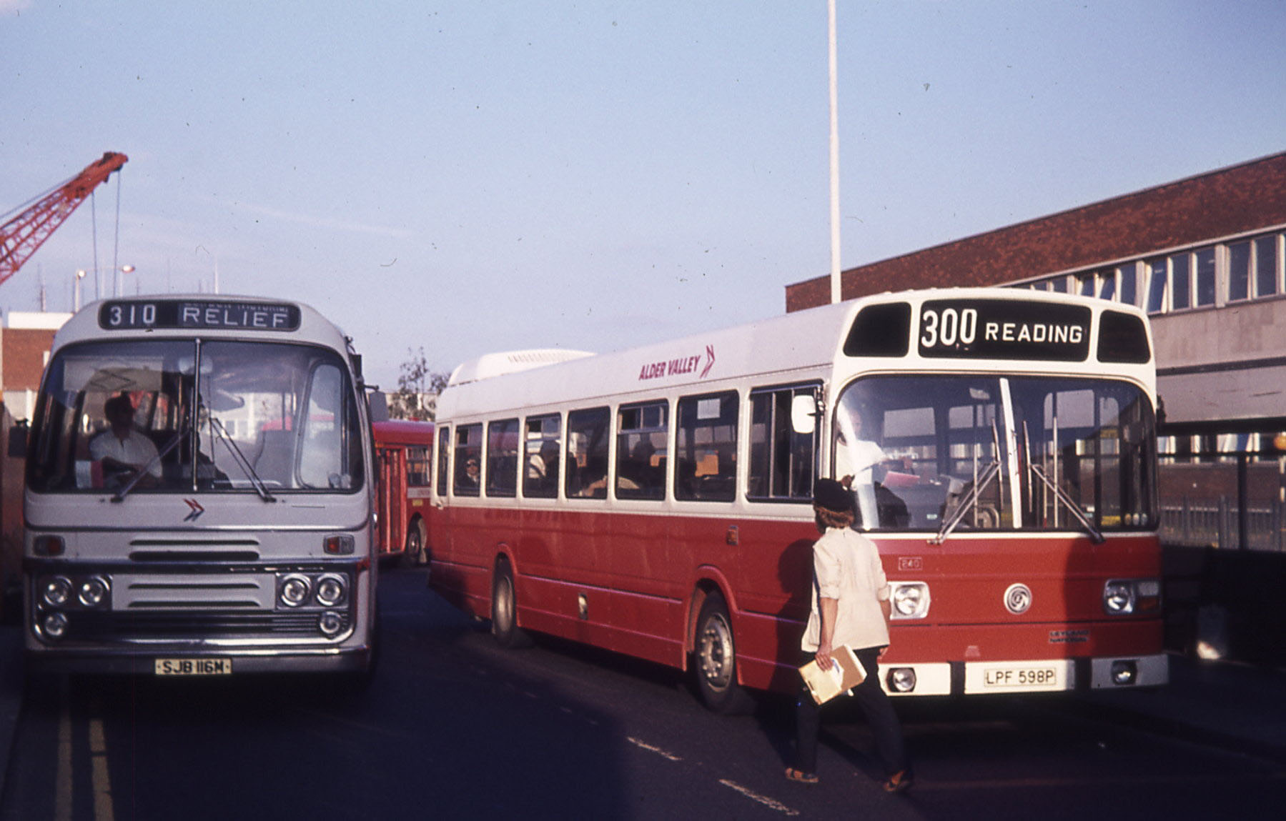 Plaxton Panorama Elite bodied Bristol RELH6G 76 (SJB116M), standing in on London commuter service 310, alongside Leyland National 240 (LPF598P) at Heathrow Bus Station.