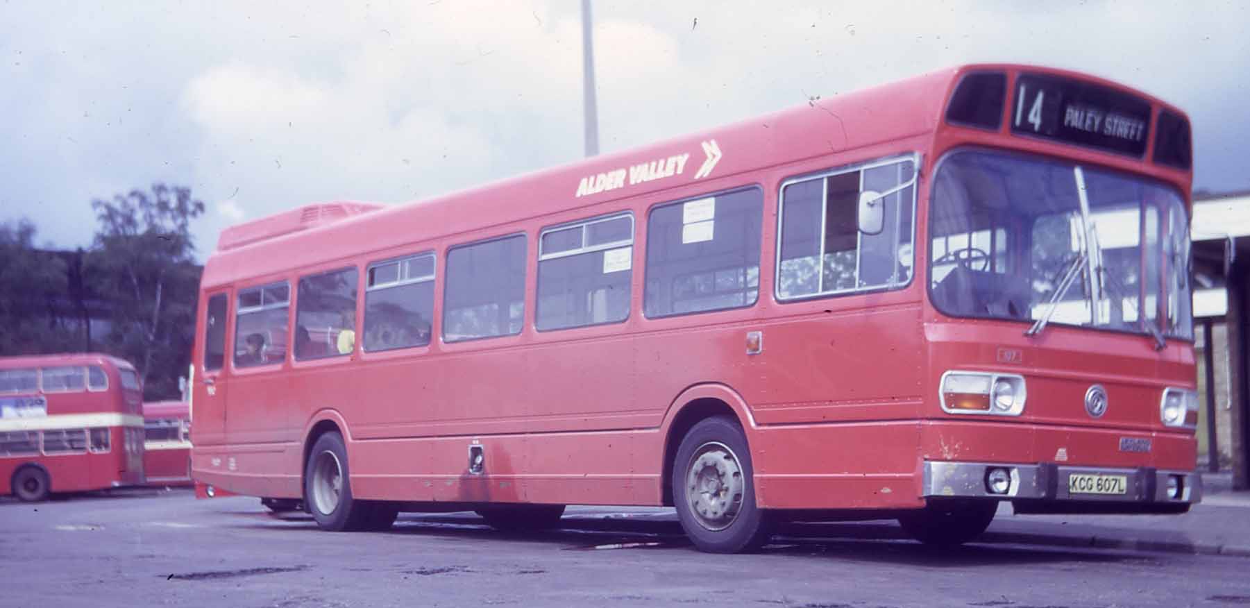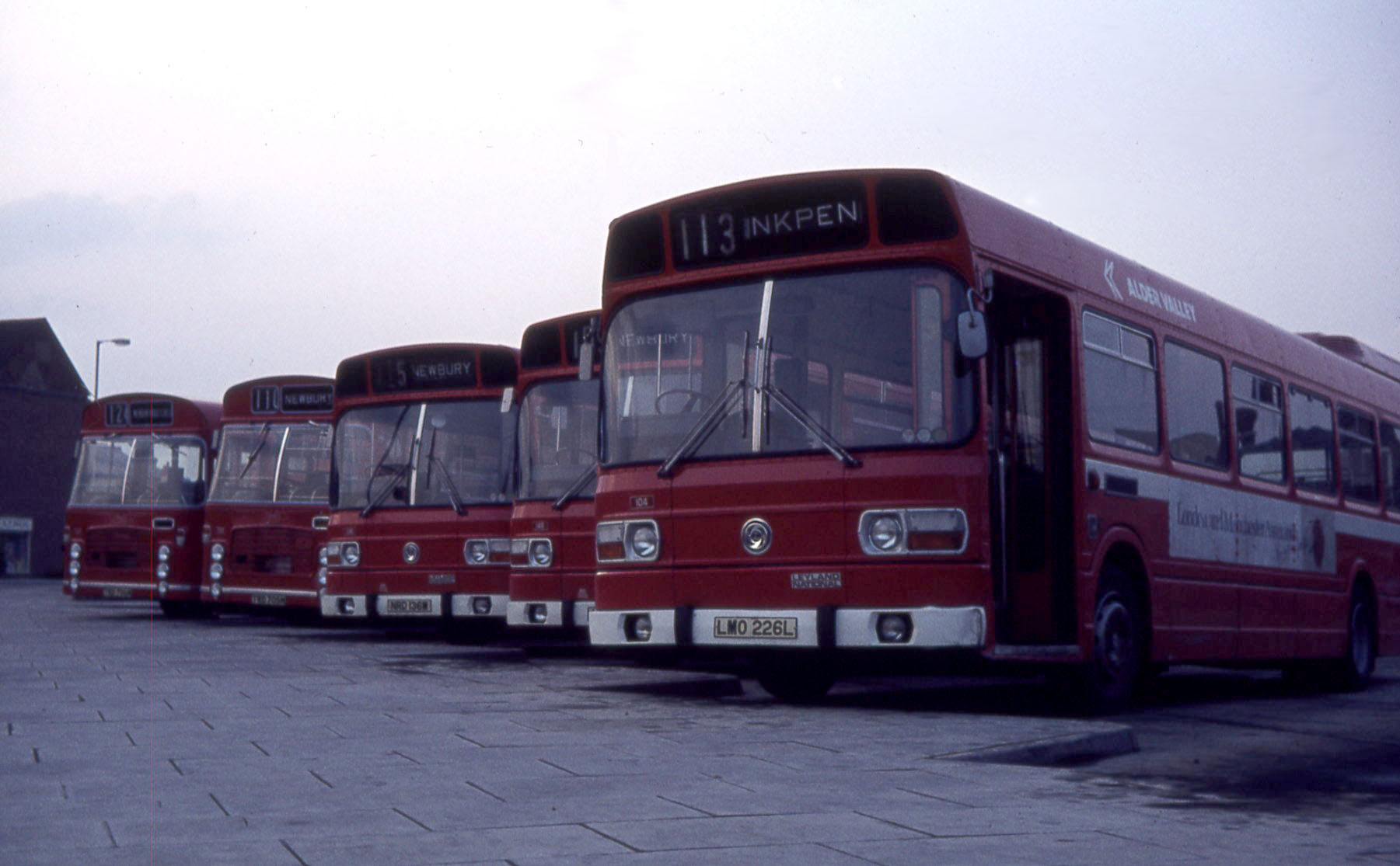 National 104 (LMO226L) is seen in Newbury Bus station alongside an unidentified National. Beyond is 136 (NRD136M) and a pair of ECW bodied Ford R1014 buses. Bus 104 was one of the first five ordered by Thames Valley, but delivered to Alder Valley. It is seen later in life than 107 above, having acquired a white band and bumpers, but yet to acquire the red and blue double N insignia on a white background. |