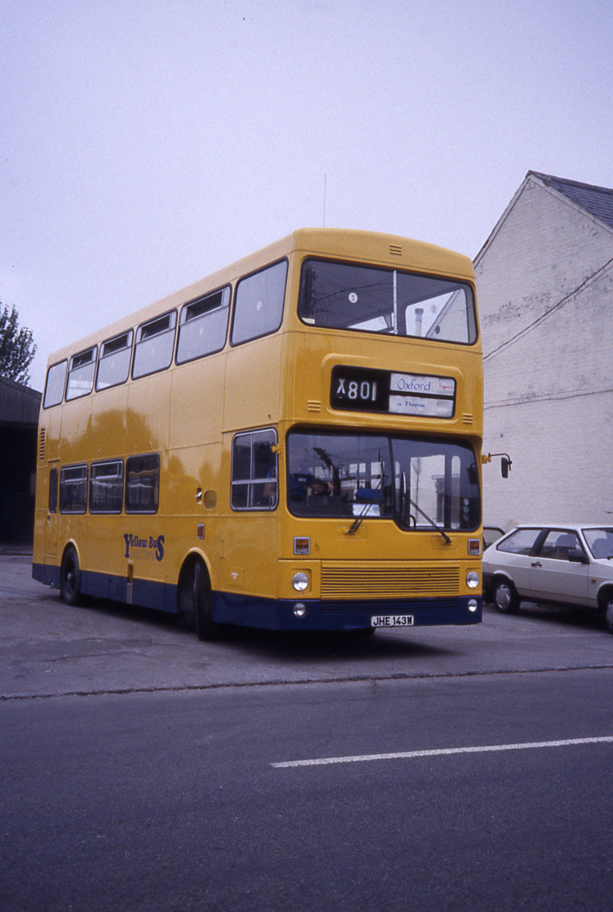 The original mainstay of the Yellow Bus doubledeck fleet, acquired primarily for service school runs from Stokenchurch and Princes Risborough to High Wycombe, were ex South Yorkshire PTE Rolls Royce Eagle powered Metrobuses. MCW JHE141W was fleet number 1. The deckers also were required for contract services into Oxford on the 280 at evenings and weekends. The service which had required huge subsidy, when operated by City of Oxford, but suddenly became commercial for most of the journeys at the point at which Oxford lost the contract. Metrobus 1 is seen leaving Oxford Cornmarket on the last journey of the day on the last day of Yellow Bus operation. The entire 280 Oxford-Aylesbury service passed to Arriva after that, when Arriva acquired the Motts operation.