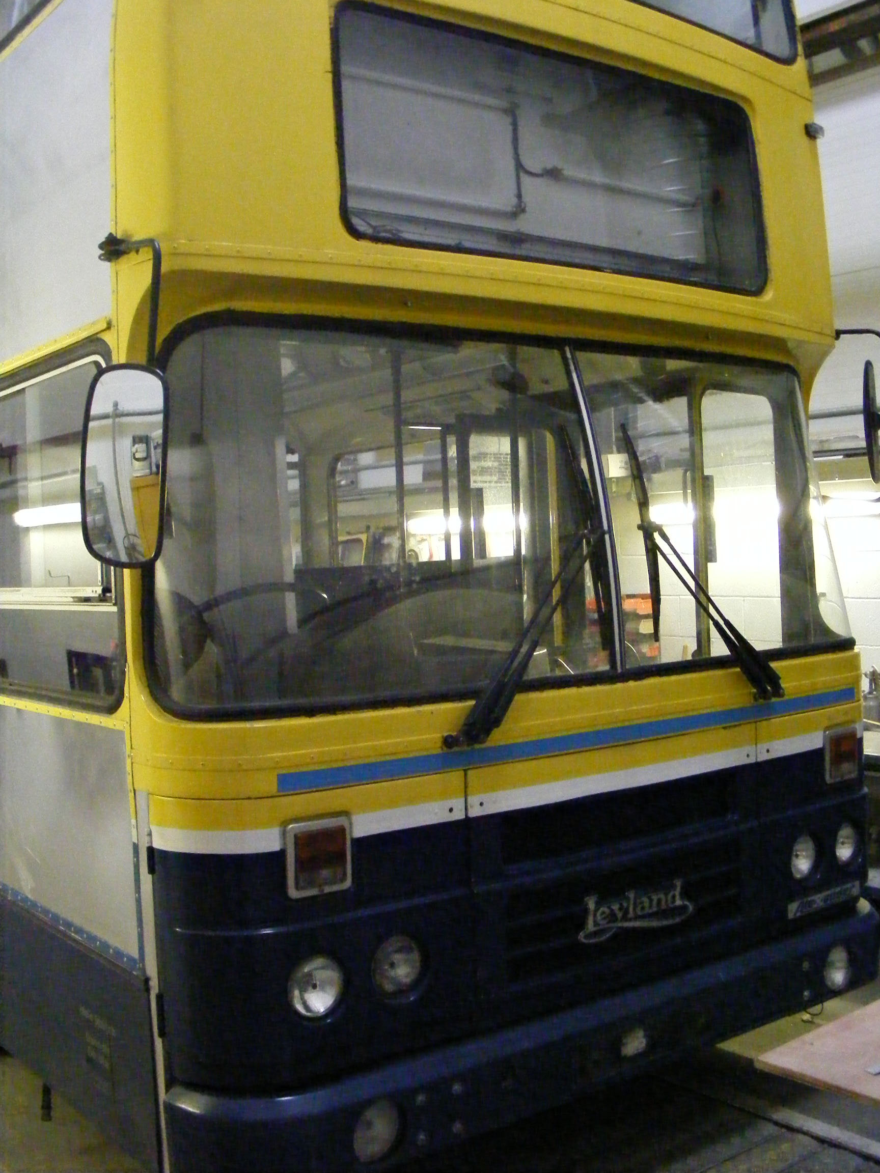 The first two Olympians that arrived with Motts Travel were Leylands. This unidentified example, thought to be RH166, is in their workshops being prepared for service. This included repanelling where necessary, repainting and removal of the centre door.