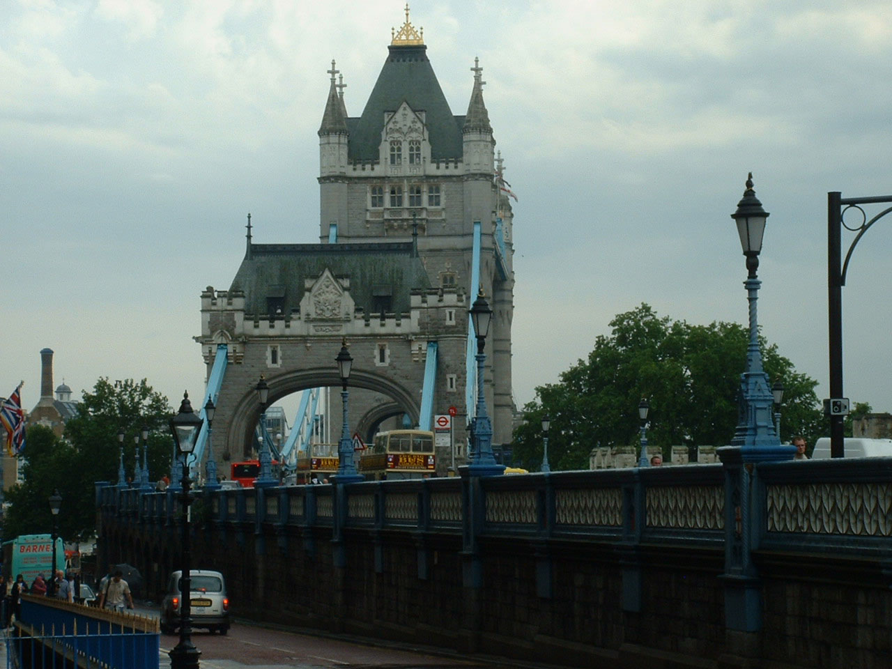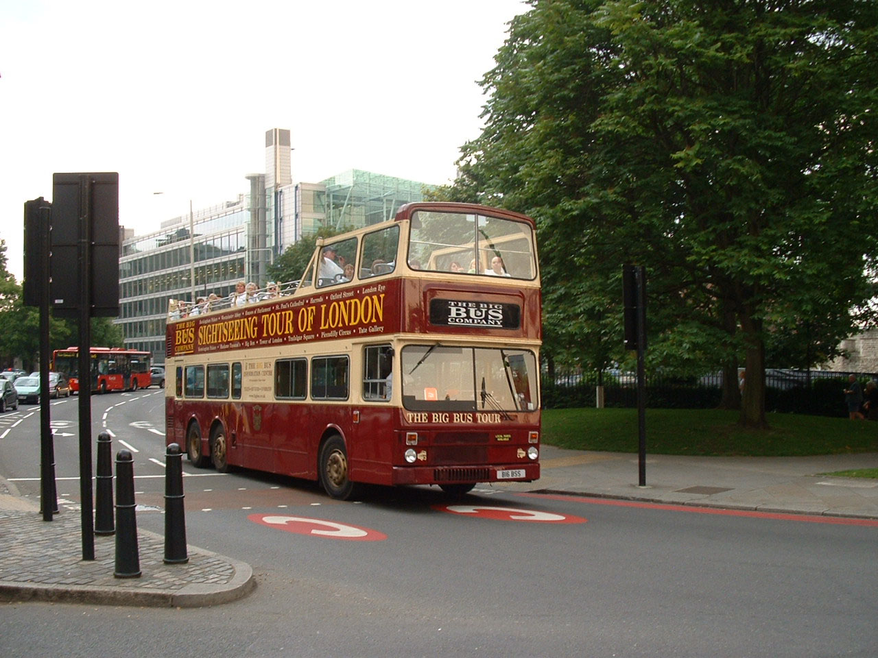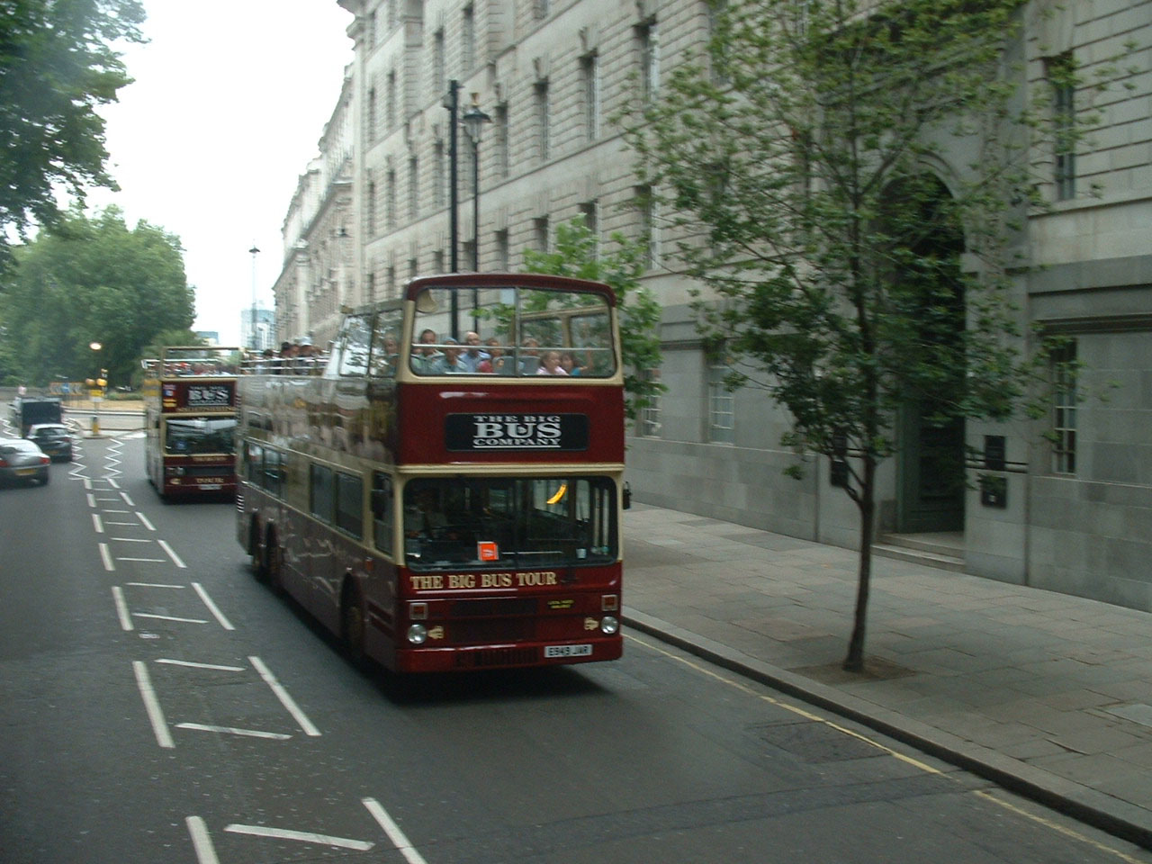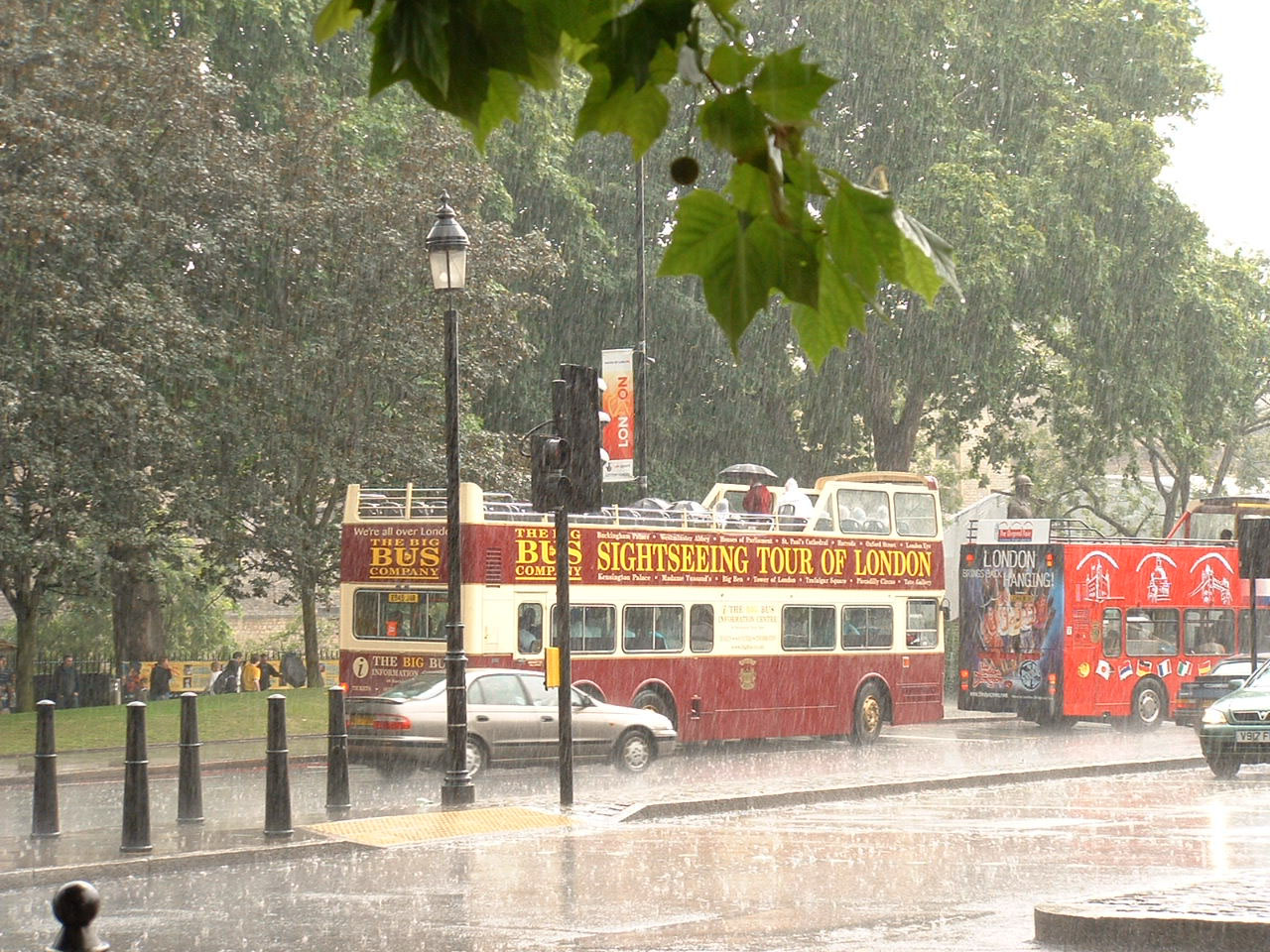 Operating open toppers in British summer weather tempts providence and those grey skies turned into a torrential downpour. Both City Sightseeing and Big Bus are prepared for such eventualities with umbrellas and plastic macs - and, of course, you can always seek refuge downstairs, which is what all but the hardiest did in this deluge outside the Tower of London. Raindrops can be seen bouncing up some distance on the road! |
