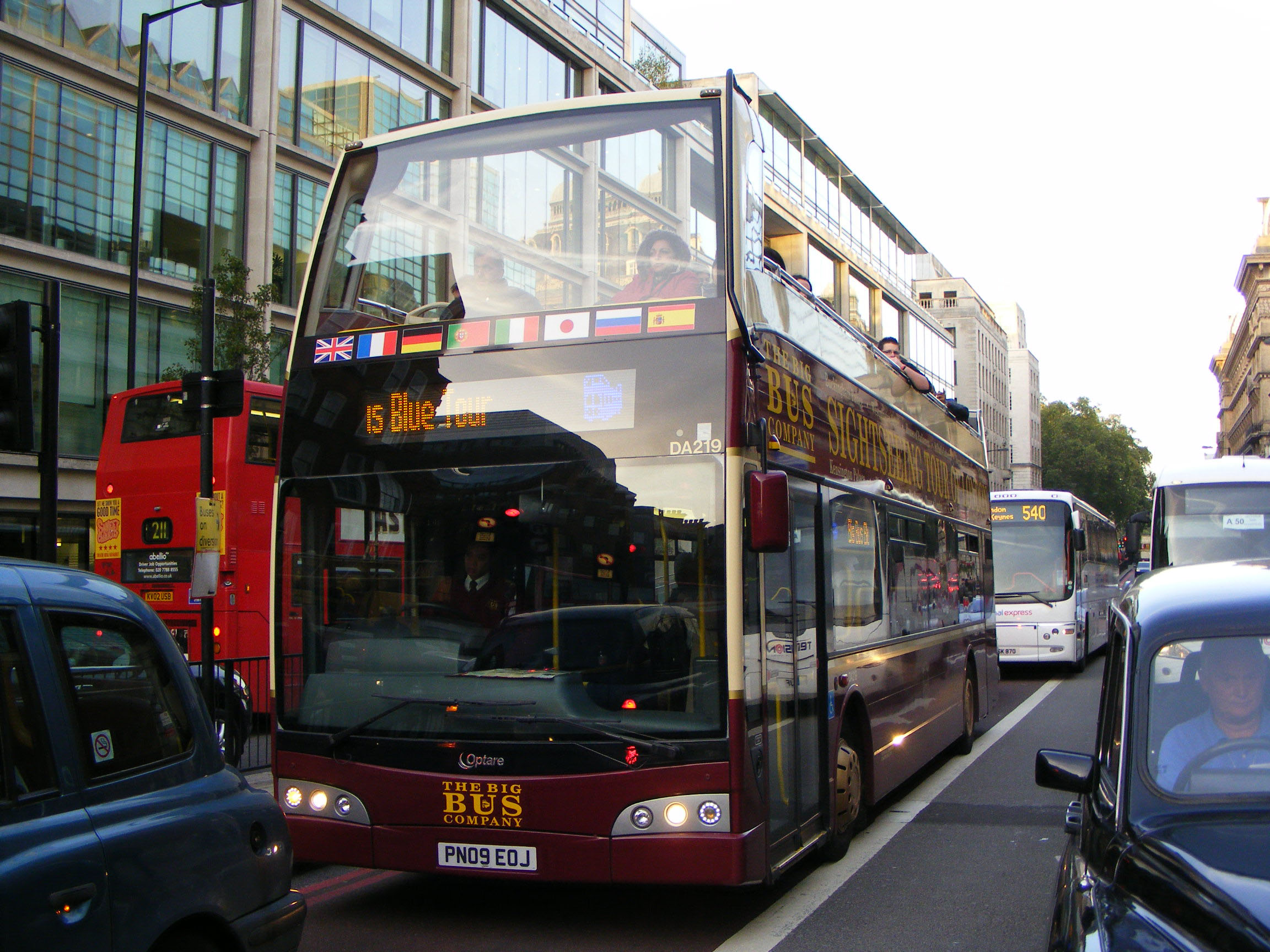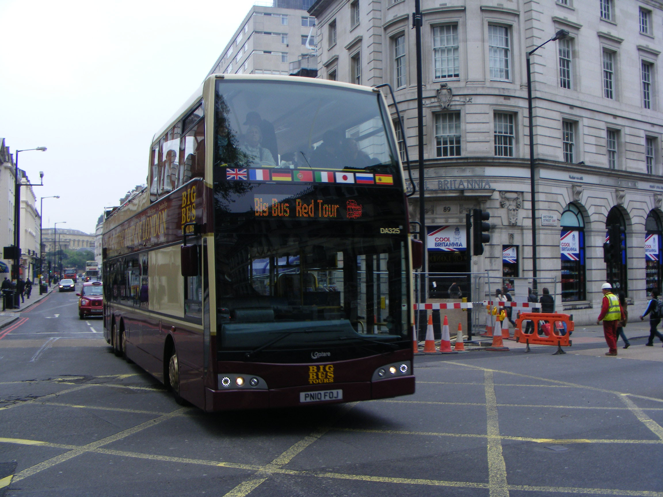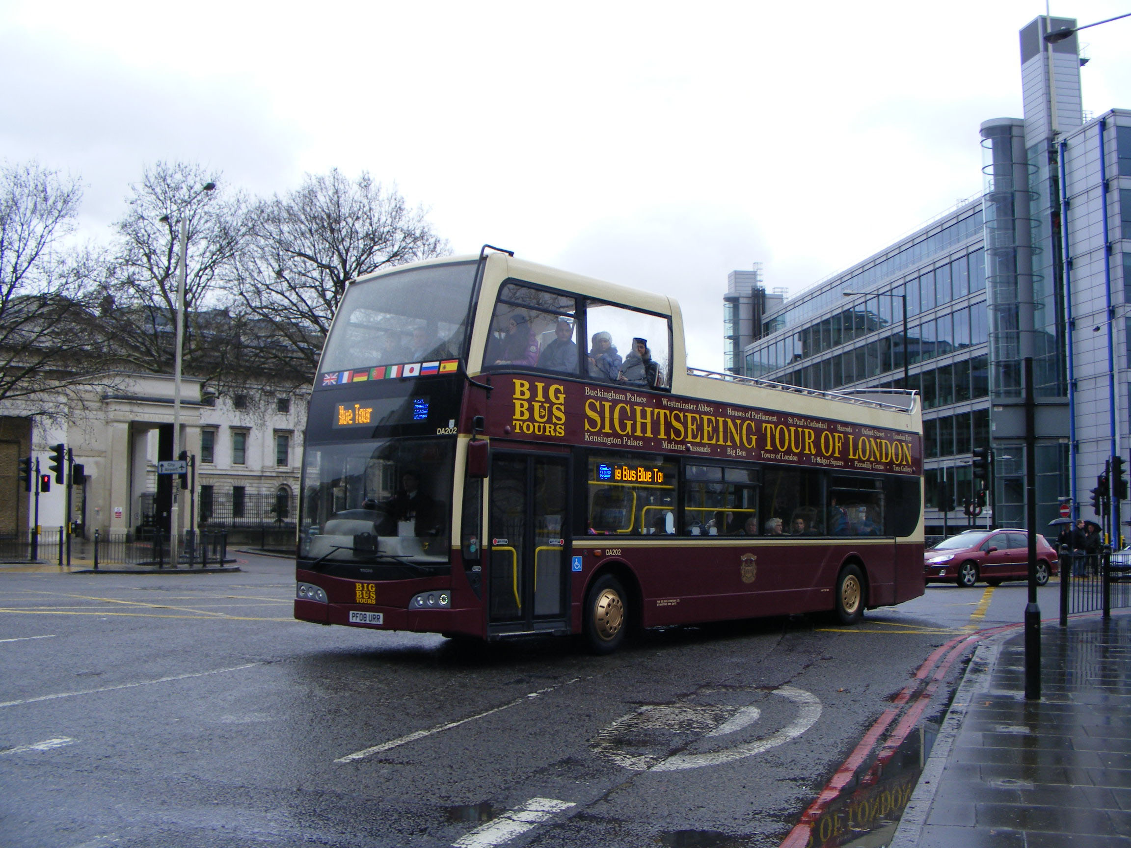 Seen in February 2011 with some brave souls on the top deck is One of Big Bus' first buses bought new for London Sightseeing work after several generations of second life London and Hong Kong examples, not forgetting the original East Kent Regent which bequeathed its livery to the entire operation. DA202 (PF08URR) was the second of ten Volvo B9TL open toppers delivered a bit late in the summer of 2008 (August) with East Lancs Visionaire bodies. The last three (DA208-210) had fully open top bodywork. |