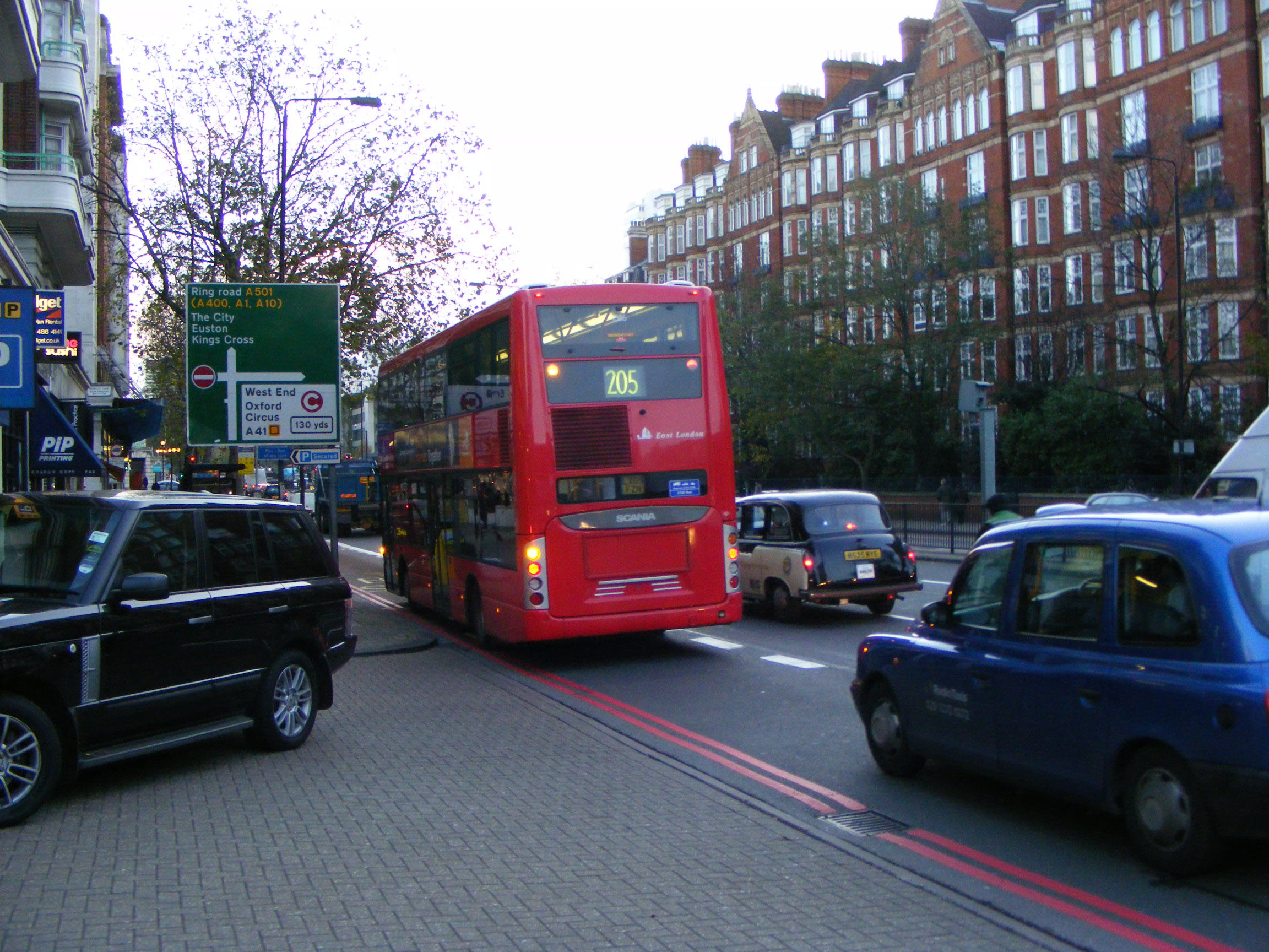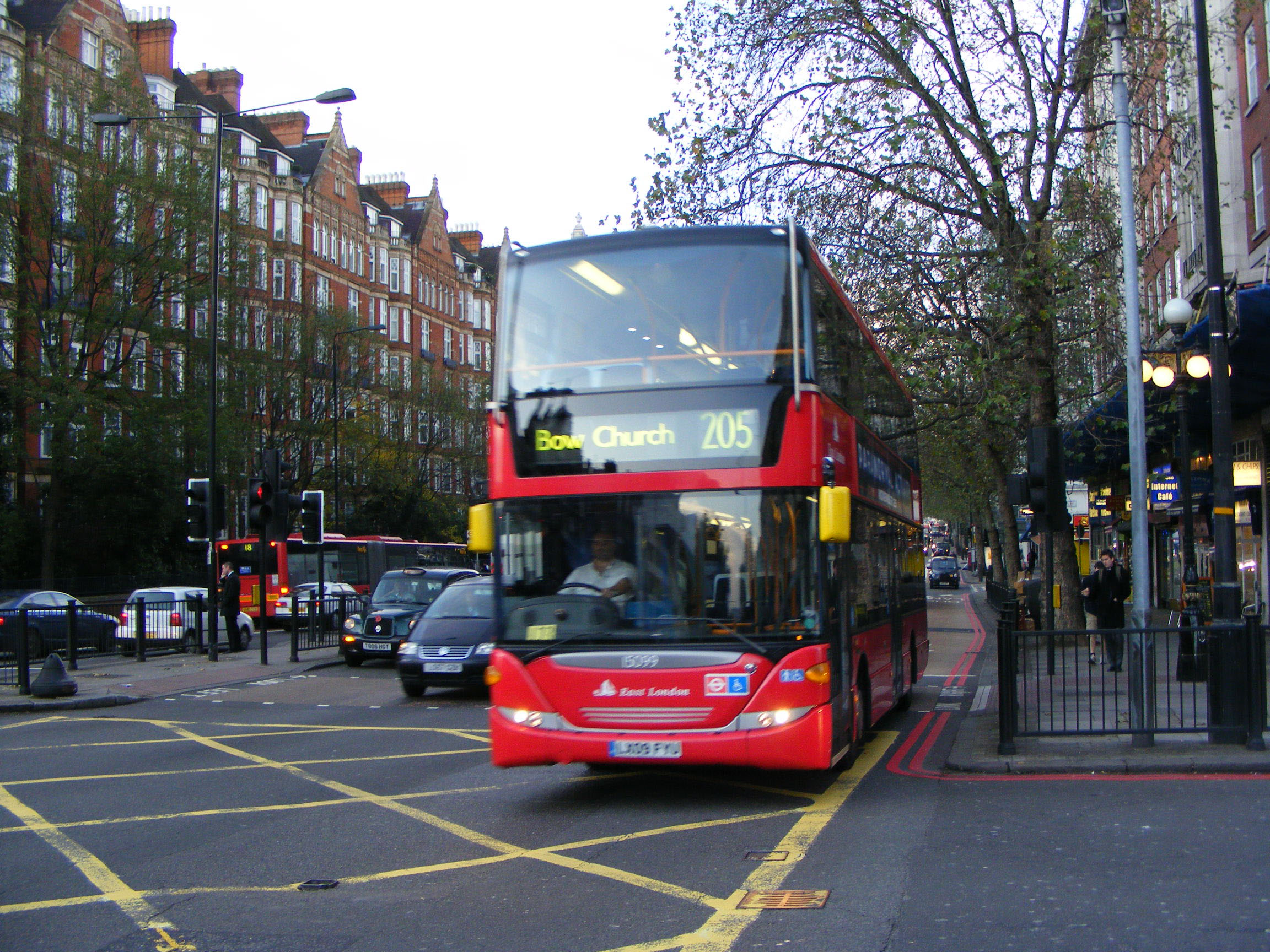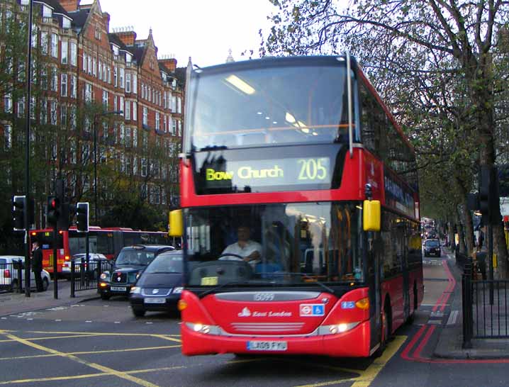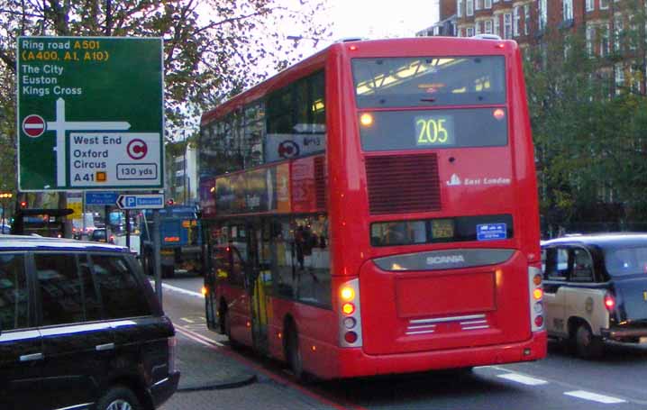 Free from Stagecoach influence, sadly East London has foresaken the British built Alexander Dennis Enviro400 in favour of the Polish built Scania Omnidekka. Here is 15099 (LX09FYU) working the 205, the station linking route recently taken over from Metroline, seen in Marylebone High Road in October 2009.