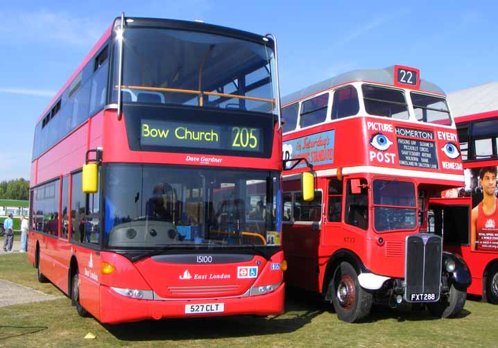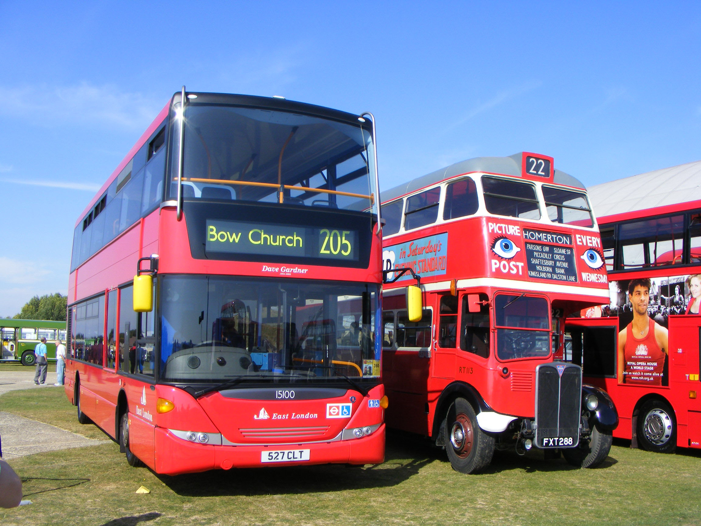 Scania 15100, bearing the registration originally born by RM1527, has been named in memory of Bow bus driver, Dave Gardner. It was posed next to pre-war RT113 (FXT288) at gloriously sunny SHOWBUS 2009. Unexpected arrival, Trident T1 was able to park the other side of the RT.