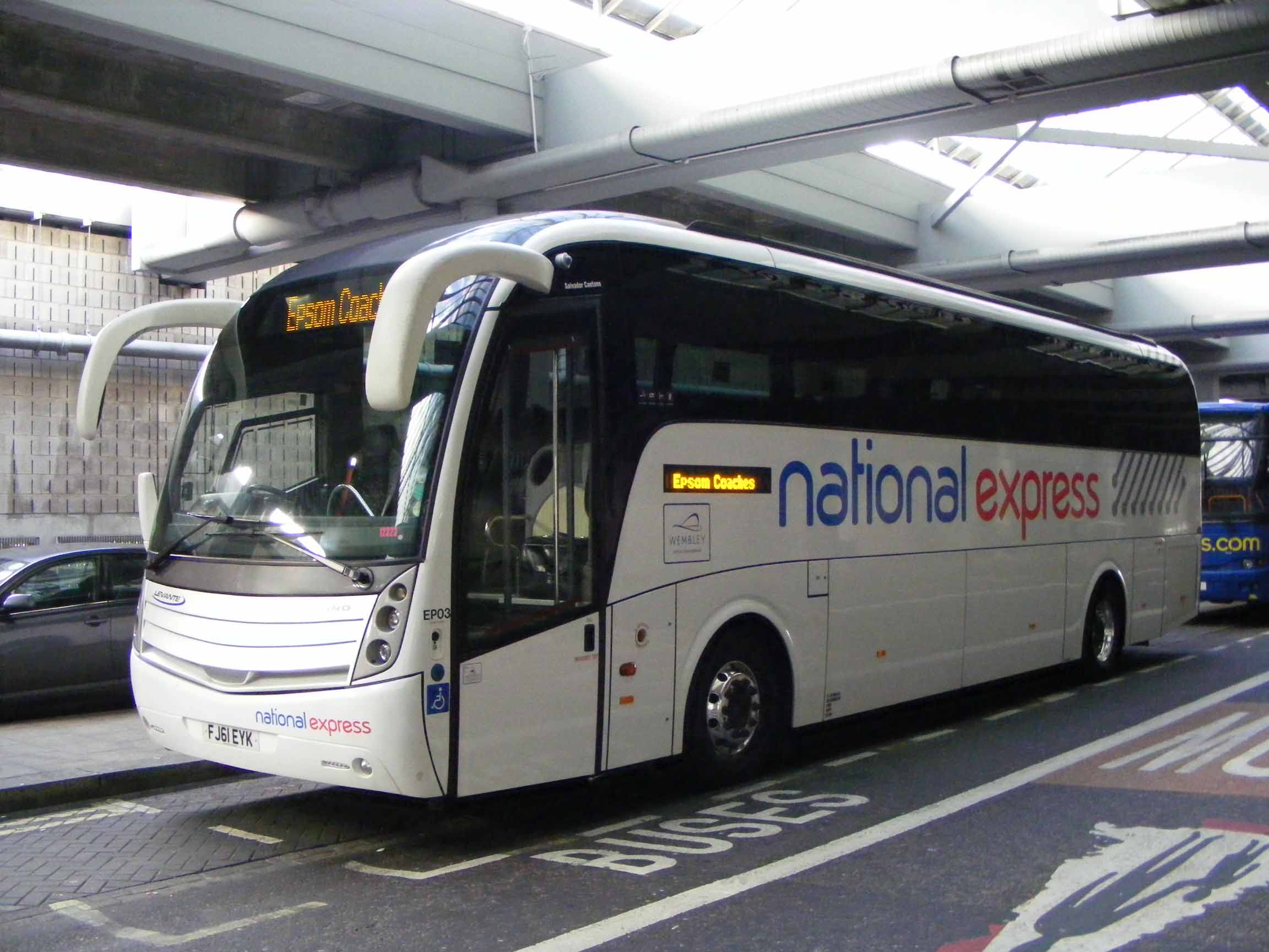 In May 2013 another Caetano bodied B9R was seen on layover in the Victoria Coach Station annex in National Express livery, EP03 (FJ61EYK), note the blind is set to Epsom Coaches. |