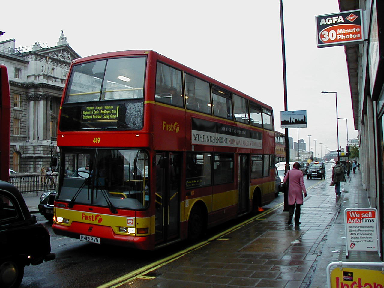 Just coming off a wet Waterloo Bridge at the end of October 2003, is 419 (P419PVW) was one of the dwindling number of Dennis Arrows still in London. Fellow London Arrows are being despatched to the provinces. Arrow 419 is on route 1, usually the preserve of Plaxton bodied Tridents.