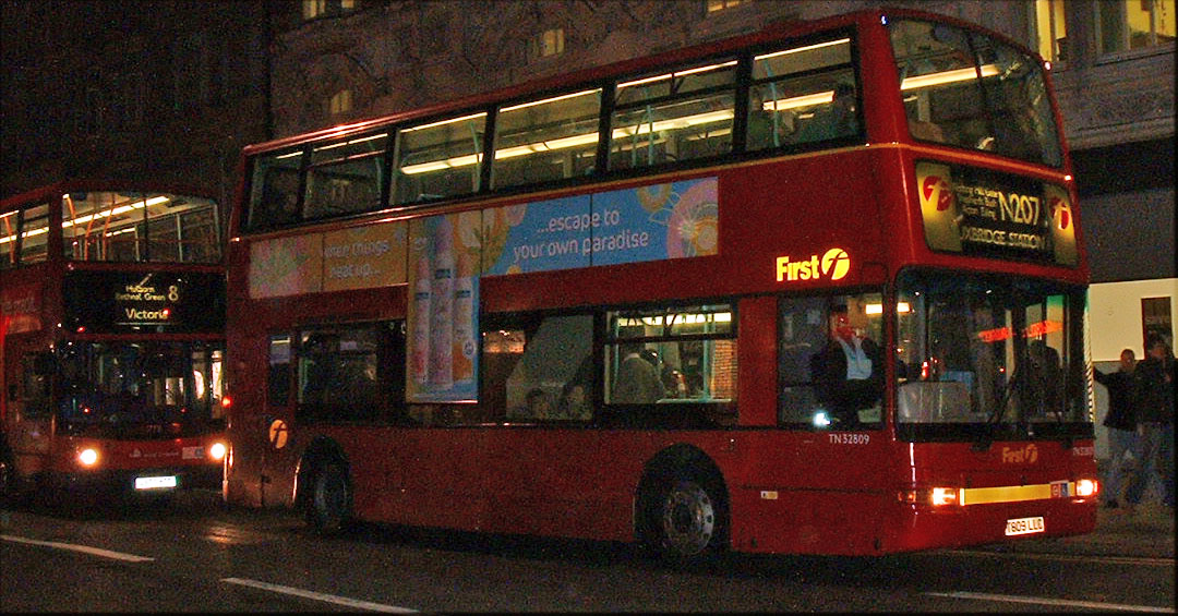 TN33809 (T809LLC) is seen similarly liveried in May 2008, with the between headlamp yellow strip retained too. The bus is on night service N207 heading for Uxbridge, but unlike the daytime 207 which starts at Shepherds Bush, the N207 kicks off at Trafalgar Square and TN33809 is seen in Oxford Street.