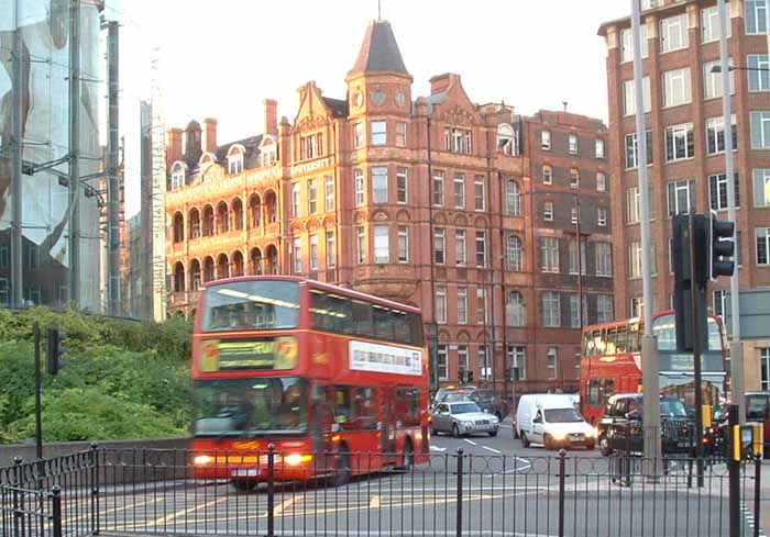 Seen in Wembley is TN968 (X968HLT) a Plaxton President bodied Dennis Trident on the 18 to Euston Station. Showing signs of tree damage, the bus was one of the first to acquire distinguishing yellow markings on the wing mirrors, but also lower down on the front, presumably to aid its visibility. |