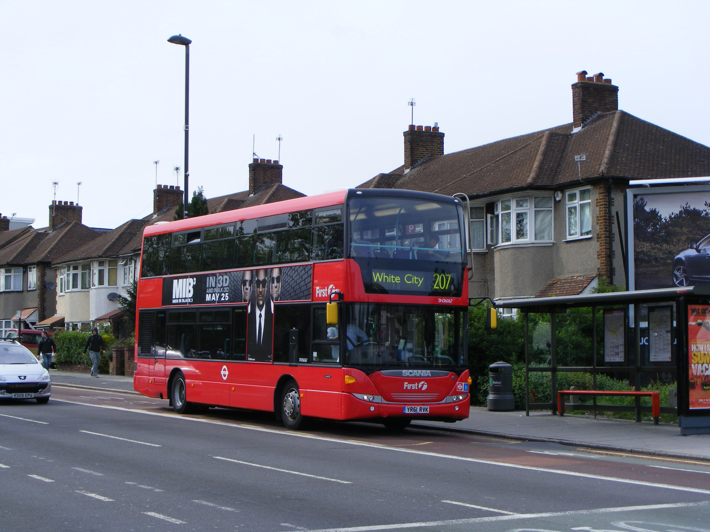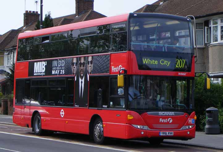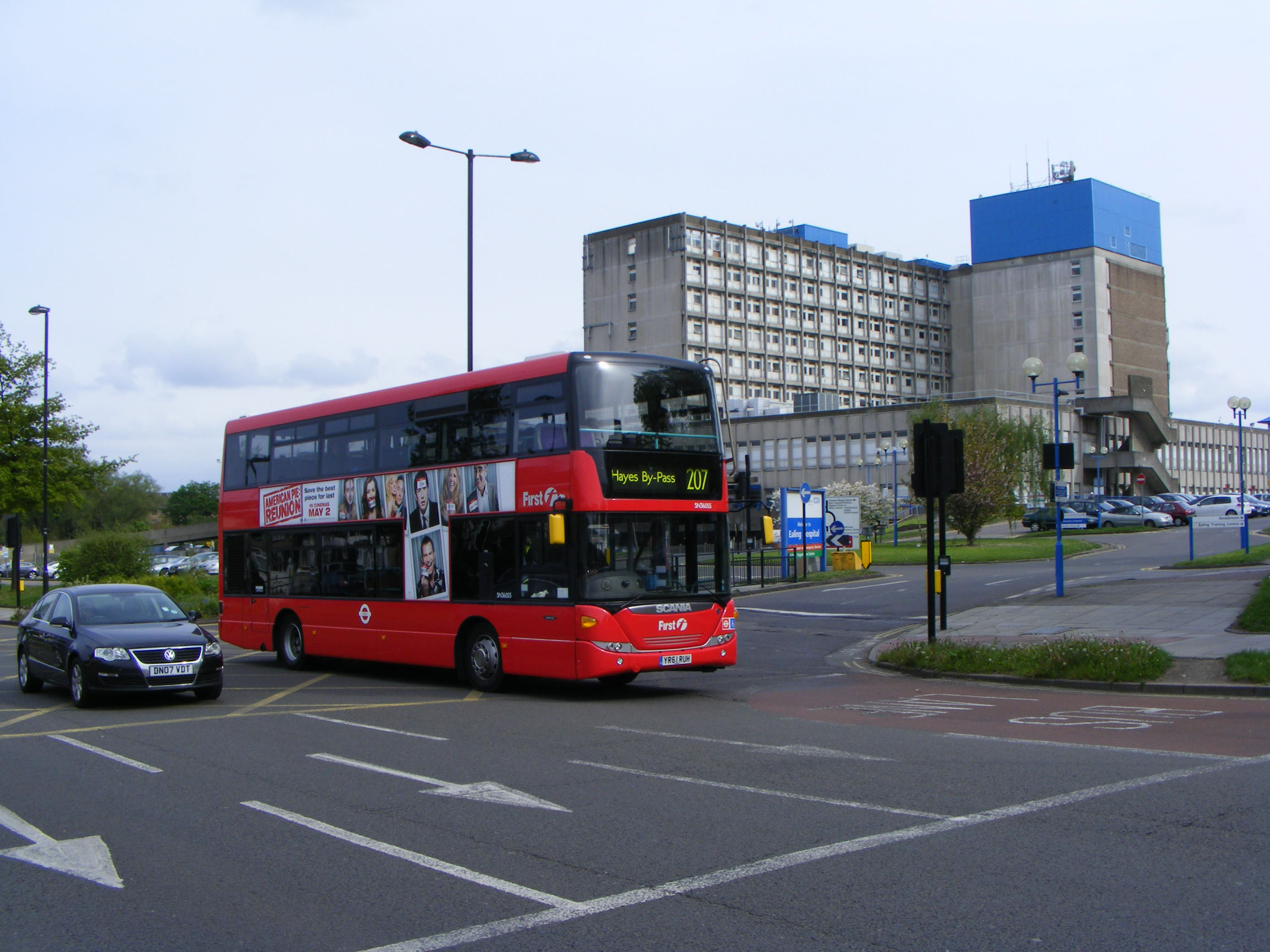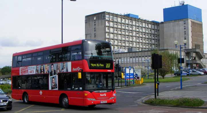 An non-standard purchase for First London was a batch of Scania Omnidekkas to replace the final bendibuses on the 207 from White City to that landmark destination, Hayes-by-Pass. Scania SN36055 (YR61RUH) is seen passing Ealing Hospital on May 5th 2012. |