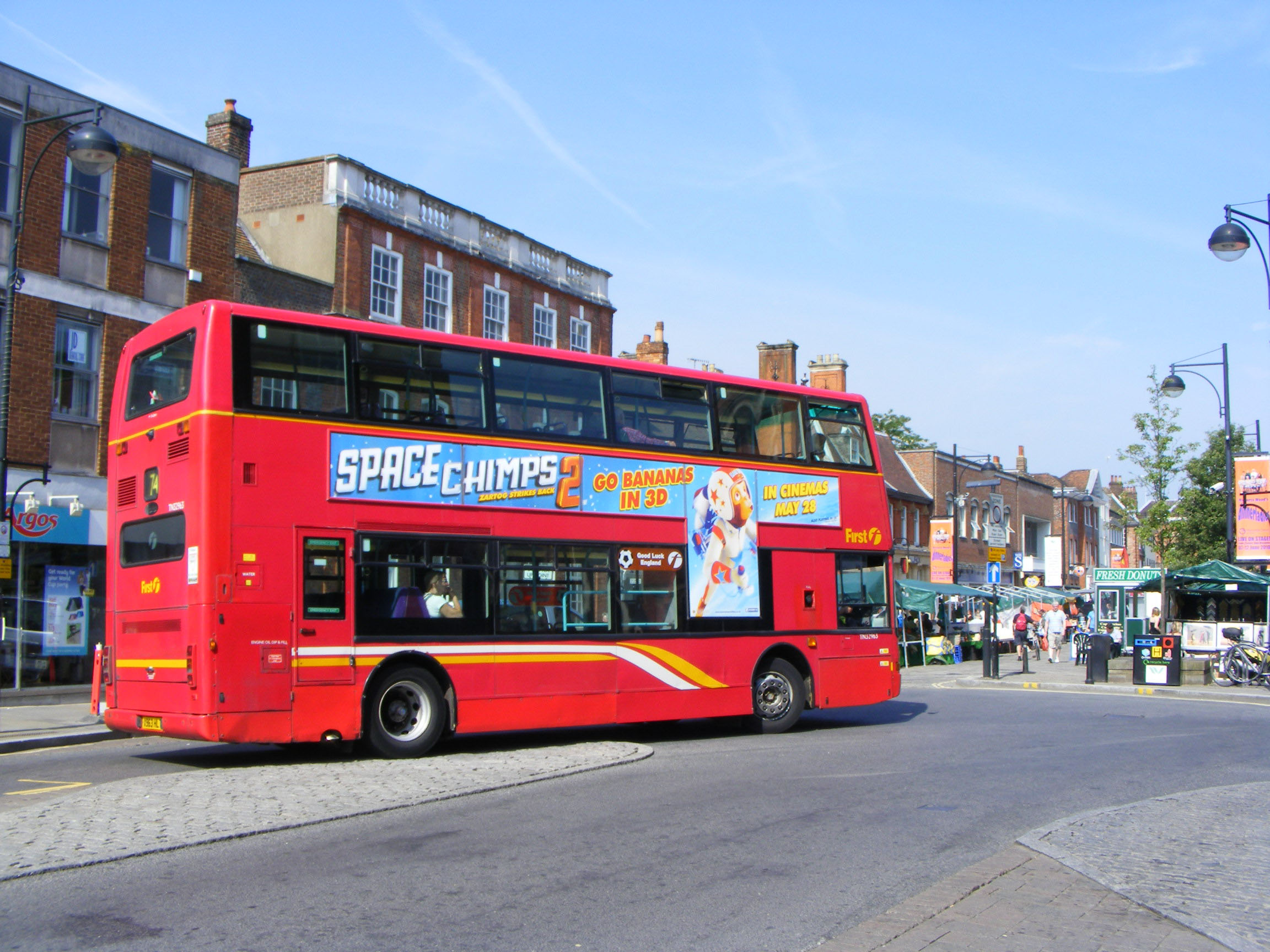 As will be seen better in this shot once TN32963 had turned into the High Street there is a special decal in the first offside window. It depicts the message Good Luck England sandwiched between a football and the First F symbol. The same message appeared on First buses nationwide for the 2010 World Cup.