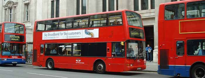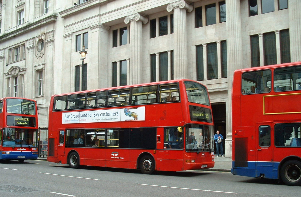 East Thames Volvo B7TL Plaxton President VP152 (X152FBB), sandwiched between Metroline doubledeckers in summer 2006. A closer glance reveals it working First's 23 route, the bus was actually on hire to First.