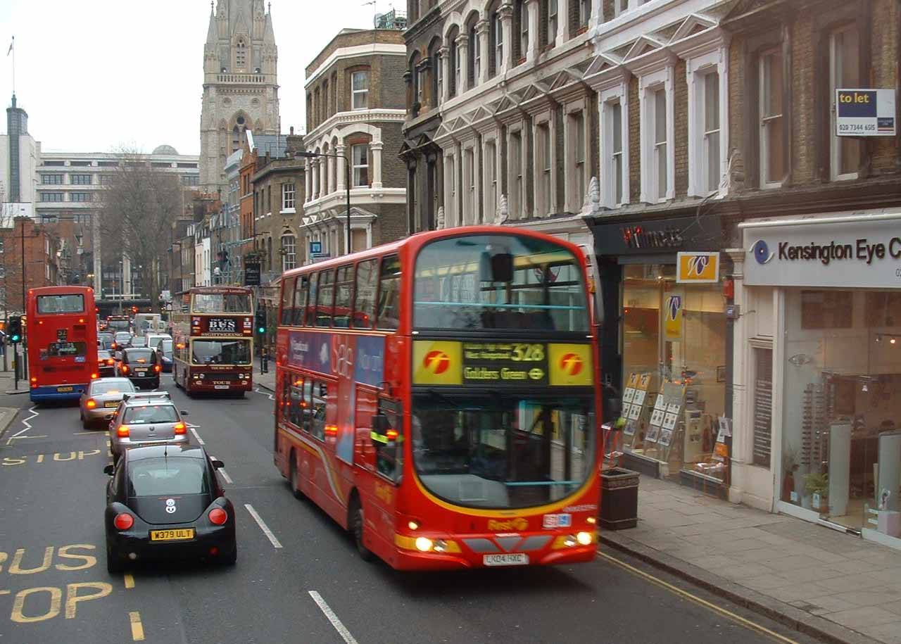From ALexander bodied minibuses to doubledeckers has been the fate of the high frequency 28 and 31 routes when converted from less frequent crew operation back in the eighties. The 62 seat Volvo B7TLs are only 2 seats short of a Routemaster! First Centrewest 32414 (LK04JBV) is seen in what might be the leafy Kensington suburbs, were it not January 2006 and leaves were long gone.