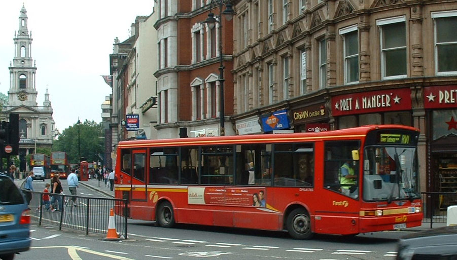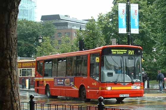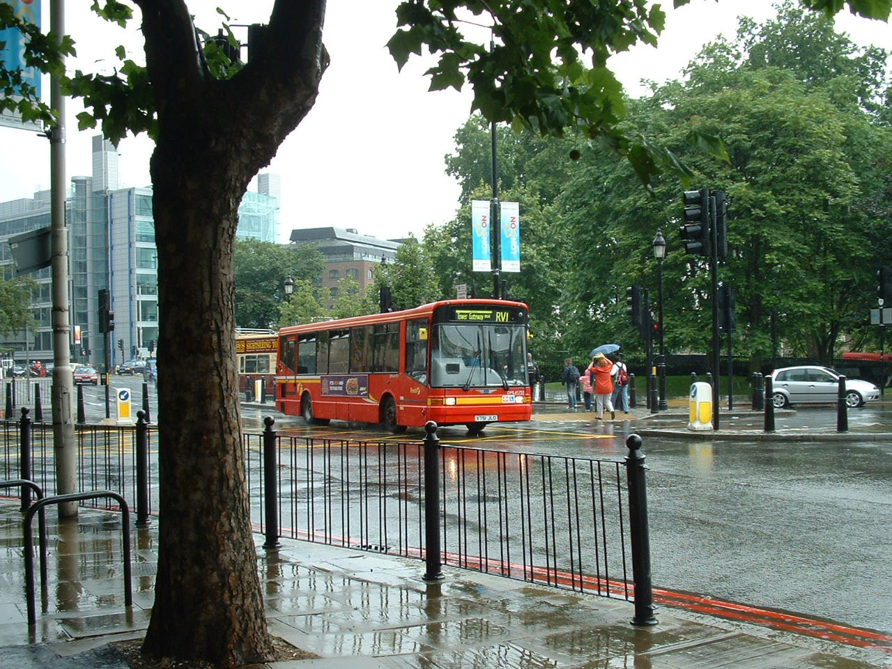 Standard First Dart/Marshalls, as well as doubledeck Tridents, substituted for Citaros on the RV1. Trident pictures can be found in the Trident low floor doubledeck gallery. DML41751 (X751JLO) is seen passing the Tower of London in a summer downpour in 2007.