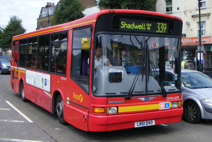 Seen at Milehouse in July 2011 is First London Dennis Dart Marshall DM41439 (LN51DVO).