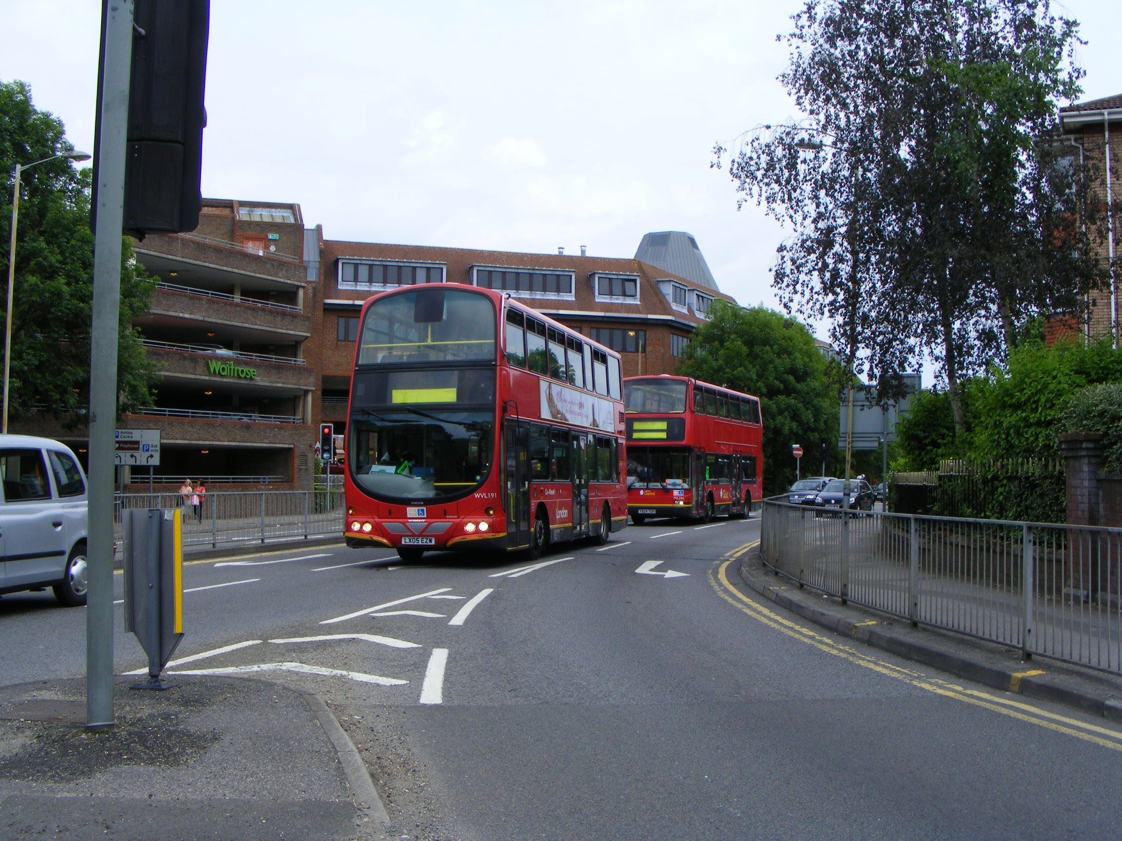 Running through Epsom town centre in July 2010 is WVL191 (LX05EZW) followed by a Plaxton dodied B7TL, both part of the large contingent of buses dedicated to the shuttle service to the Downs for the annual Epsom Derby.