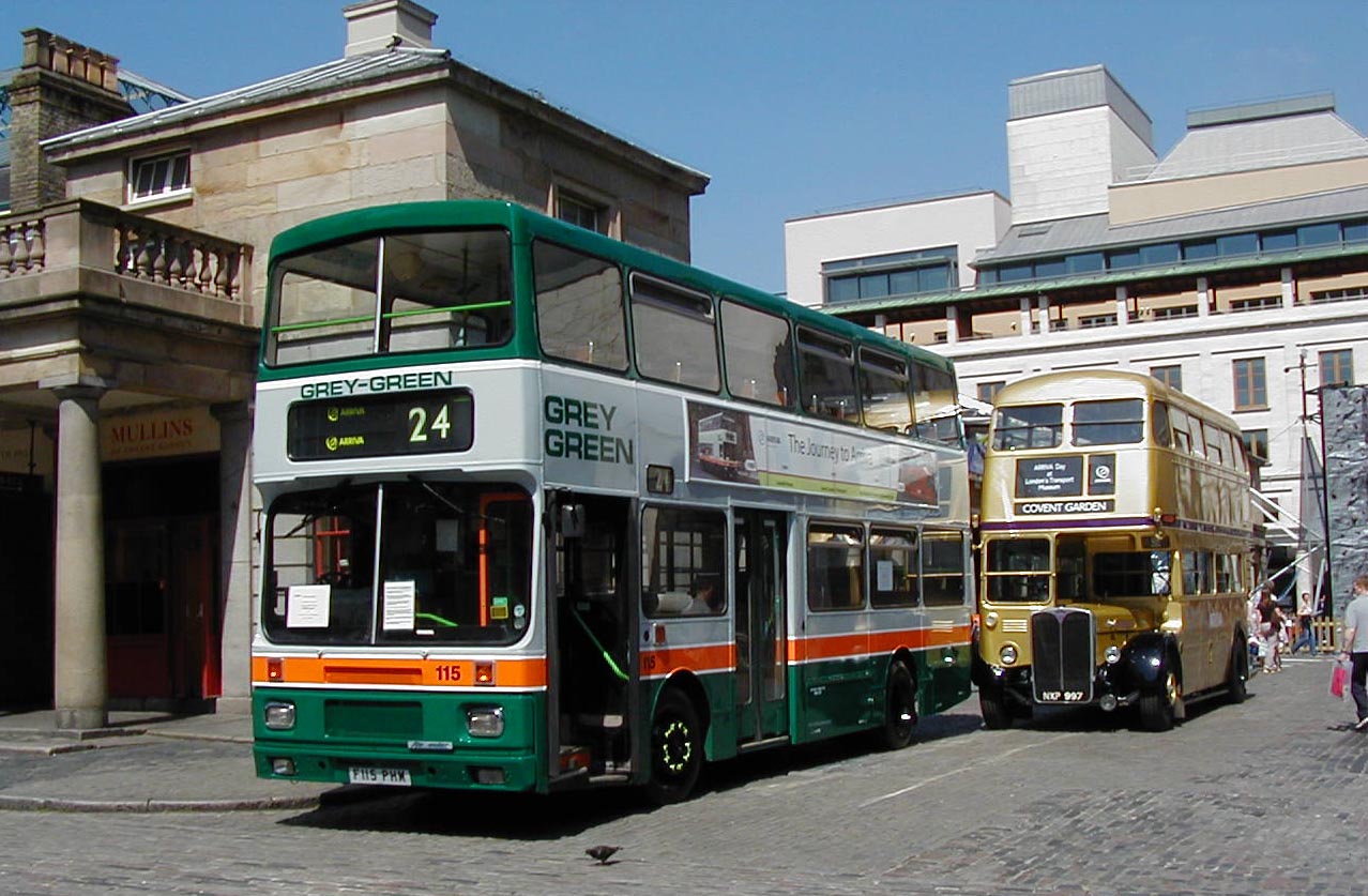 Reflecting the impact that Grey Green had when it took on central London route 24 with a fleet of brand new buses in their striking non-red colours and also acknowledging Grey Green as the seed corn of Arriva, the company chose to present 115 (F115PHM) to the Covent Garden Museum. The occasion on June 14th 2003, was marked by a display in the piaza featuring the Golden Jubilee RT (4712) seen behind 115, the first Wright Gemini bodied DAF DB250LF decker (DW1) and Arriva Midlands North's "Bus of the Future". Volvo 115 had received a full repaint into original Grey Green colours as it finished service with Arriva London. |