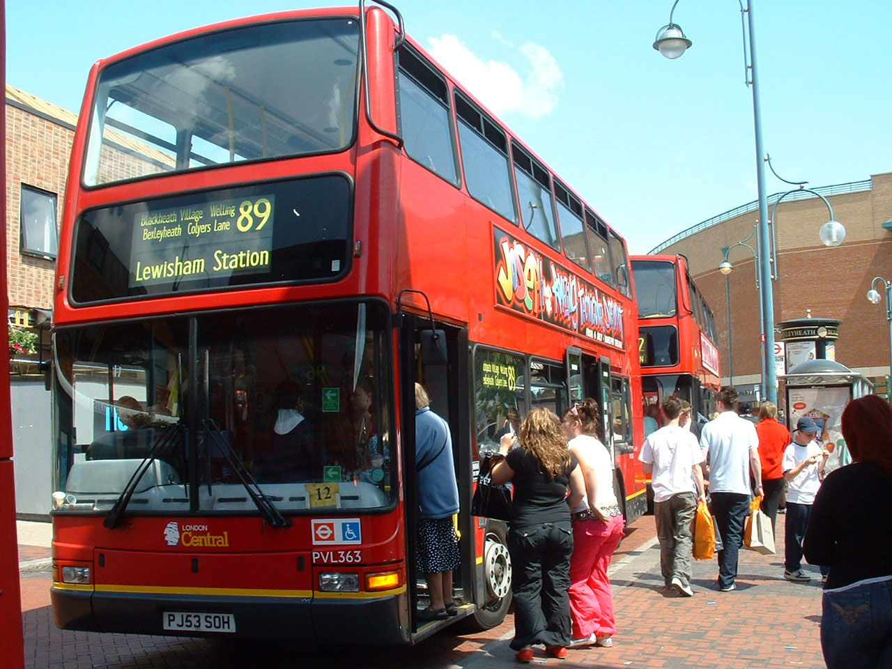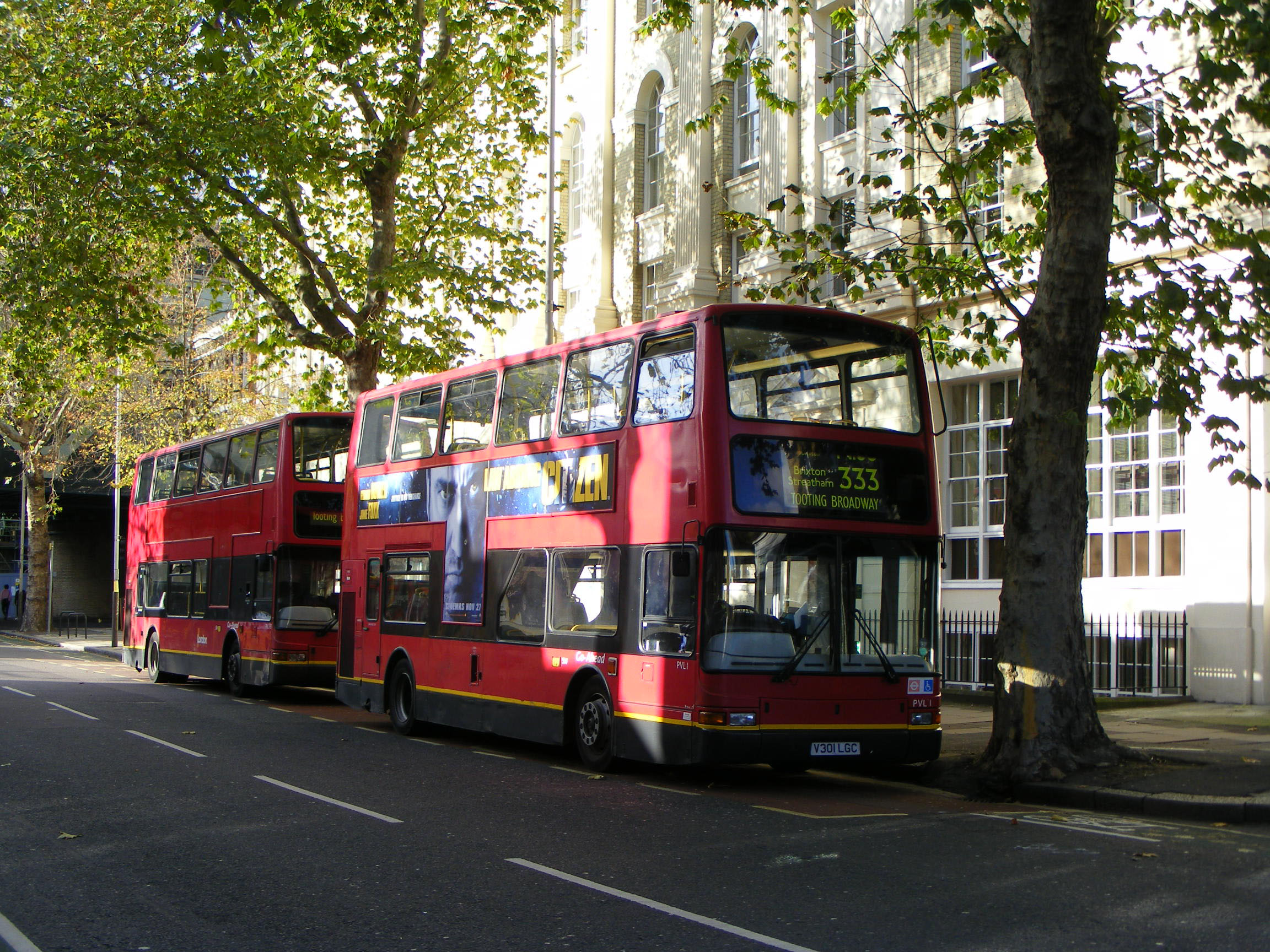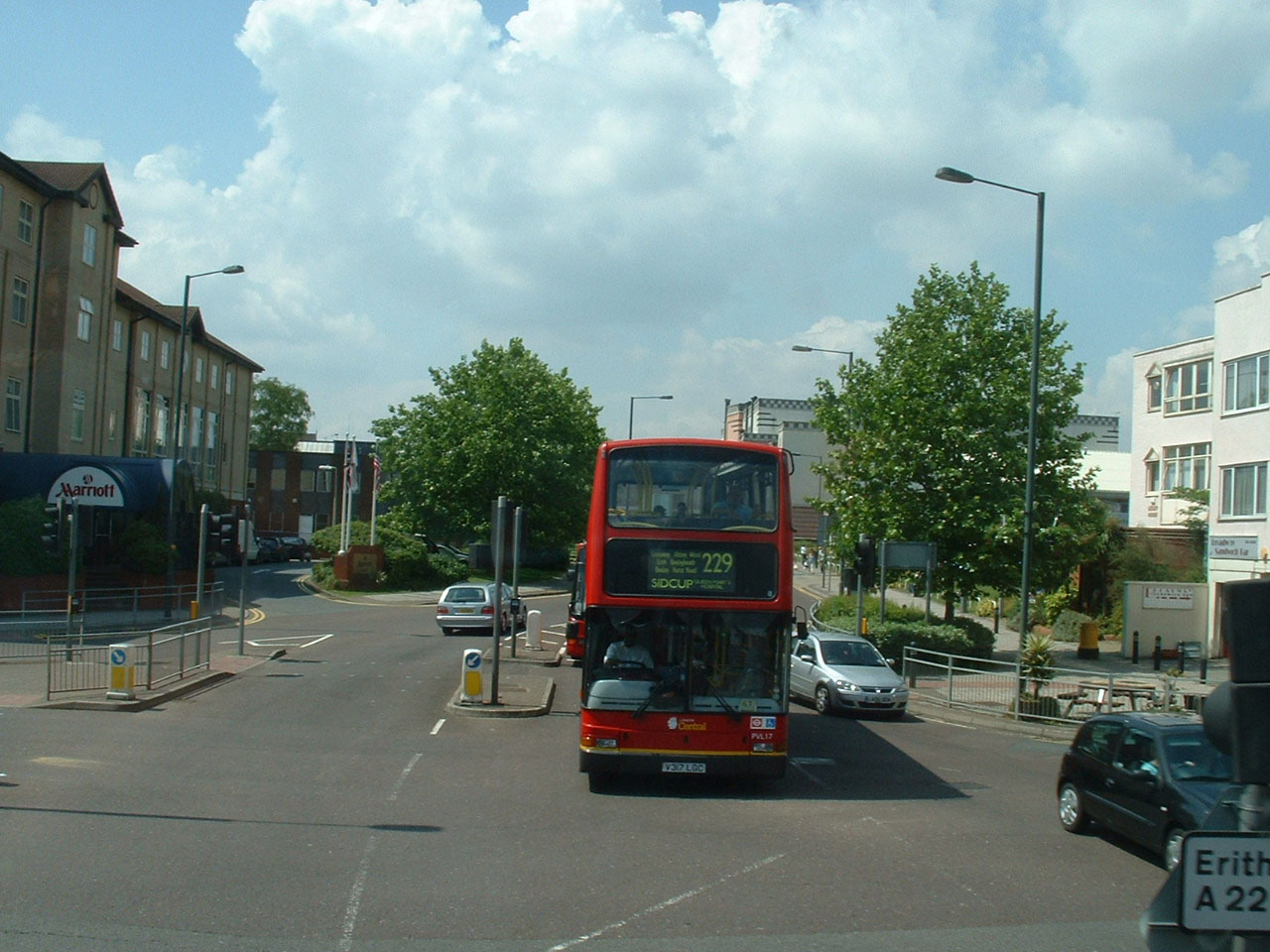 Two of London Central's new Volvo B7TL doubledeckers with Plaxton President bodywork pass each other at Greenwich North Station in the shadow of the Dome. Volvo PVL49 (V449WGH) is nearest the camera and was new in April 2000, whilst only a few weeks old, both vehicles had all been subject to thousands of pounds worth of damage, with graffiti etched on to virtually every top deck window.