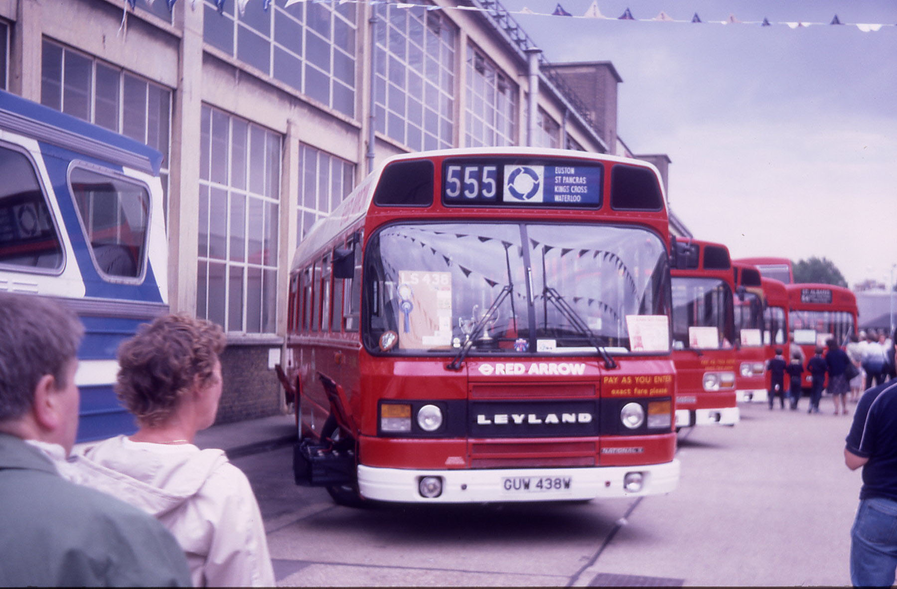To commemorate the 50th anniversary of the formation of London Transport in 1983 LT held an Open Day at the now closed famous Chiswick Bus Works. Red Arrow LS438 (GUW438W) headed a line up of London singledeckers. The bus had been displayed at SHOWBUS at Hillingdon the previous year, The bus was rebuilt in 1994 by East Lancs for further use on Red Arrow duties as a National Greenway passing with the Red Arrow services to London General. Withdrawn in 2002, it was bought by MASS Transit of Lincoln passing to Doncaster Council Department of Education in 2005 for use as in a "Stay-on-at-School" promotion, later becoming Sparky's Big Purple Bus as part of a creche facility. |