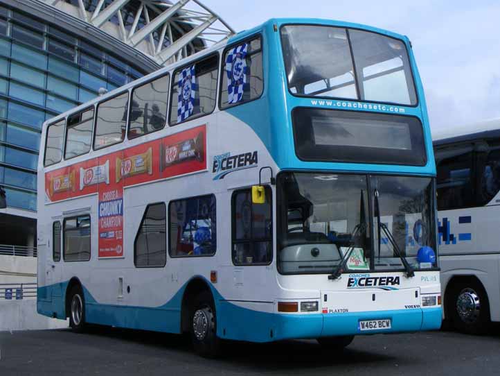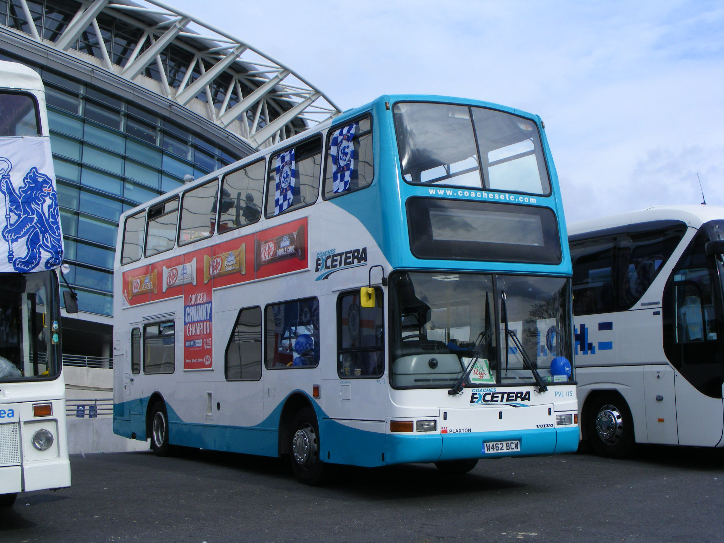 Volvo B7TL Plaxton President PVL115 (W462BCW) passed into the ownership of east London's Excetera. It is seen at the 2012 FA Cup Final having transported a band of Chelsea supporters with the Wembley Stadium as a backdrop.